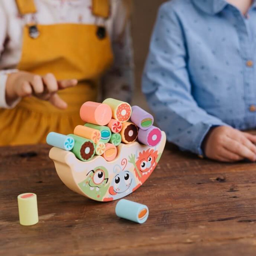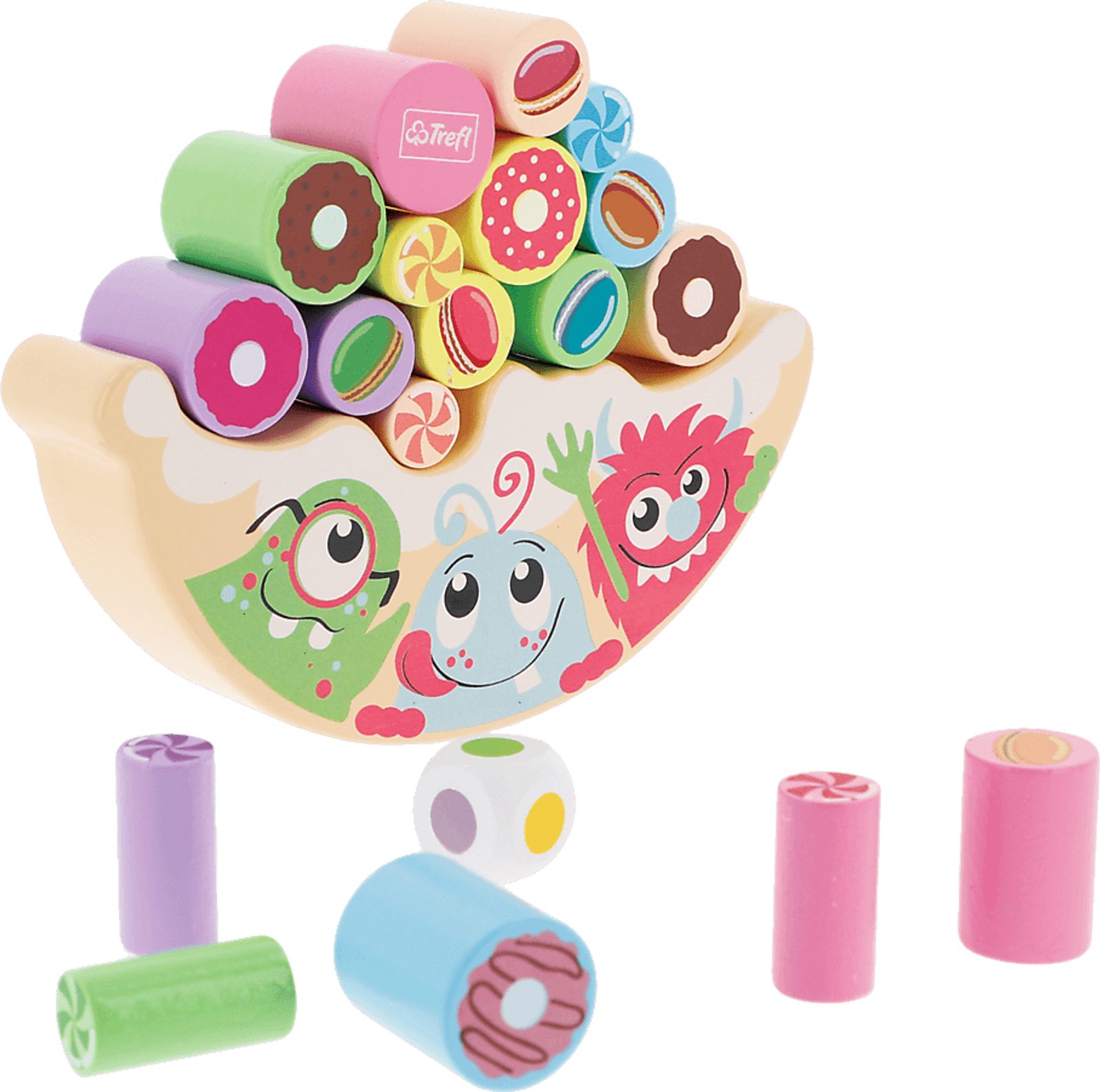 Sweets in Lot je hračka vyrobená z vysoce kvalitního přírodního dřeva. Hra spočívá v umístění co největšího počtu sladkostí nad hlavy příšer ze sušenek při zachování rovnováhy celé struktury.
