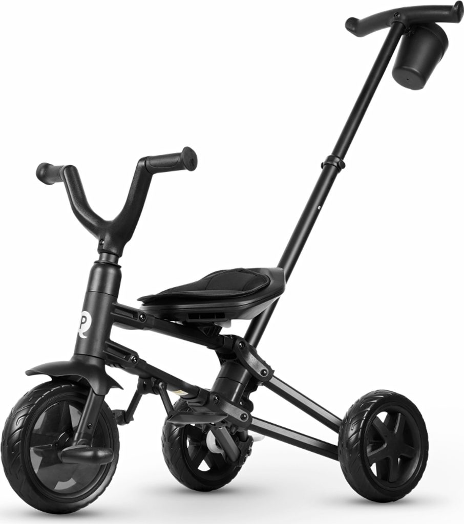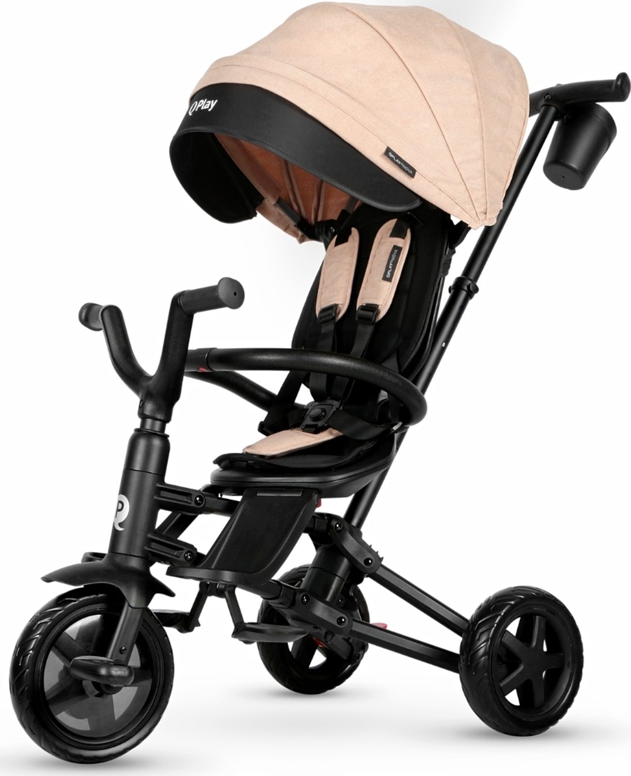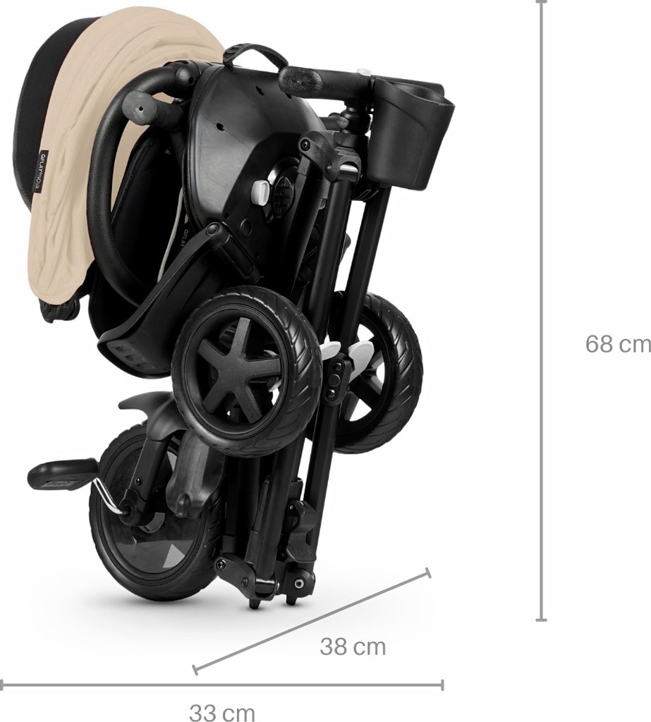 Tato tříkolka jistě uspokojí i ten nejnáročnější vkus, QPLAY využívá nejnovější trendy v barvách a pro zdůraznění designu jsou na kapotě a bezpečnostních pásech použity vložky s logem a jménem. To vše pro zvýšení jeho atraktivity. Tichá EVA kola zajišťují jízdní komfort. Volnoběžné kolo a volné řízení dávají rodiči kontrolu, aby klidně sledoval určenou trasu. Kombinace hliníkové konstrukce a prvků z vysoce kvalitních materiálů zaručuje odolnost.