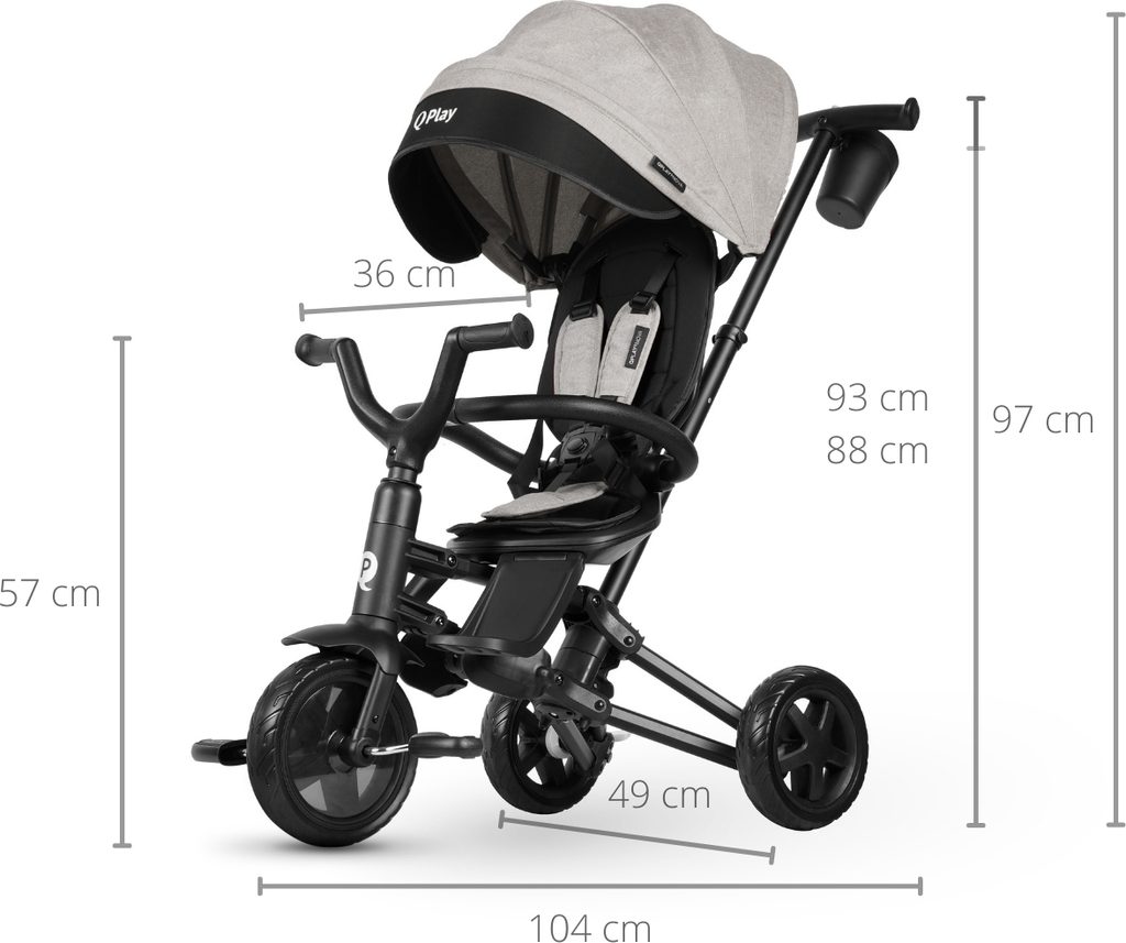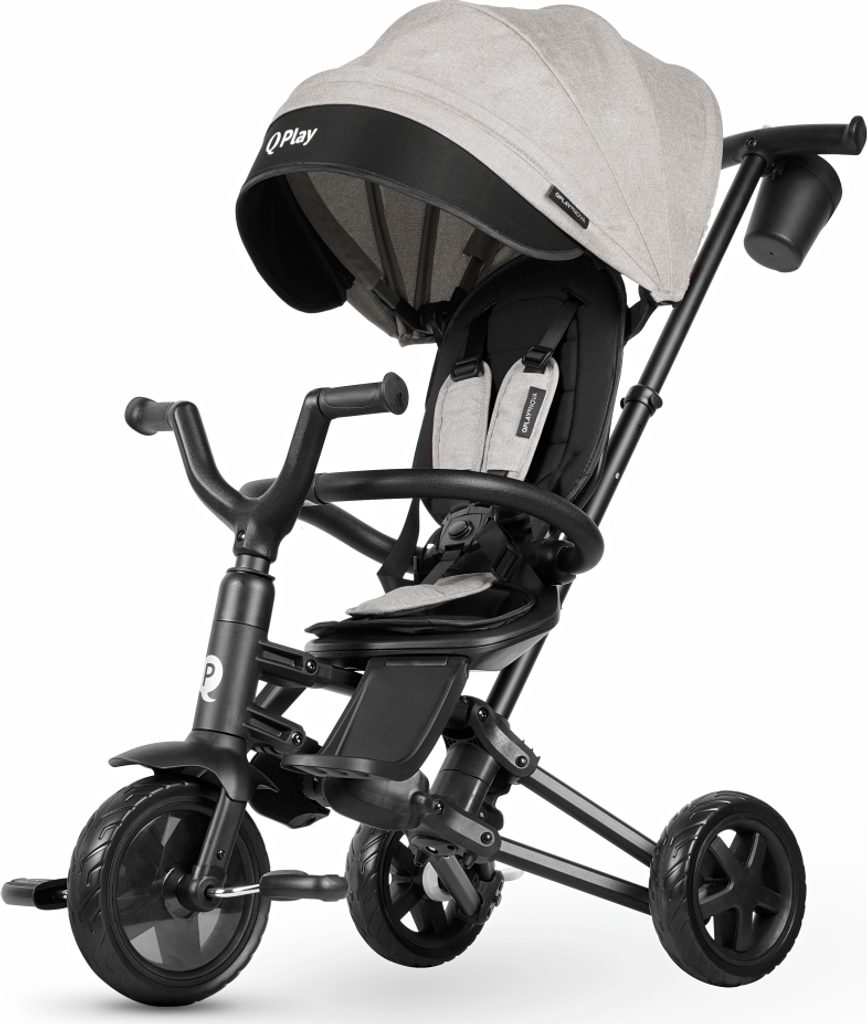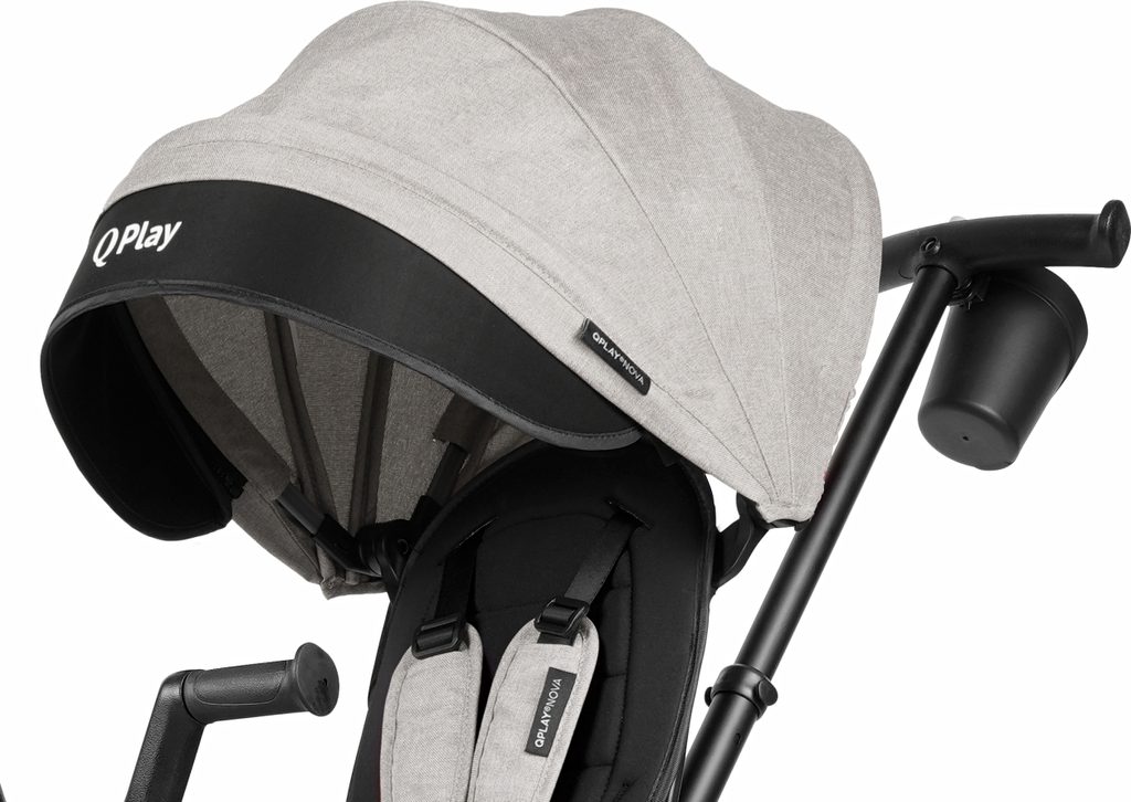 Tato tříkolka jistě uspokojí i ten nejnáročnější vkus, QPLAY využívá nejnovější trendy v barvách a pro zdůraznění designu jsou na kapotě a bezpečnostních pásech použity vložky s logem a jménem. To vše pro zvýšení jeho atraktivity. Tichá EVA kola zajišťují jízdní komfort. Volnoběžné kolo a volné řízení dávají rodiči kontrolu, aby klidně sledoval určenou trasu. Kombinace hliníkové konstrukce a prvků z vysoce kvalitních materiálů zaručuje odolnost.