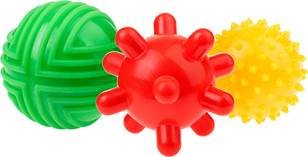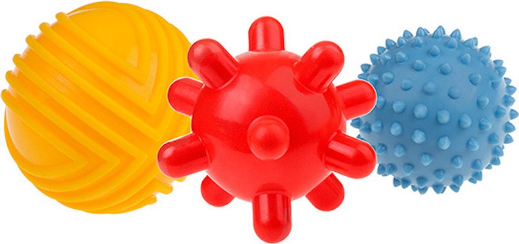 Míčky jsou ideální pro jemnou a příjemnou masáž. Při držení míčku nebo šlapáním na něj bosými nožičkami stimuluje rozvoj smyslů dítěte a pomáhá rozvoji rovnováhy.