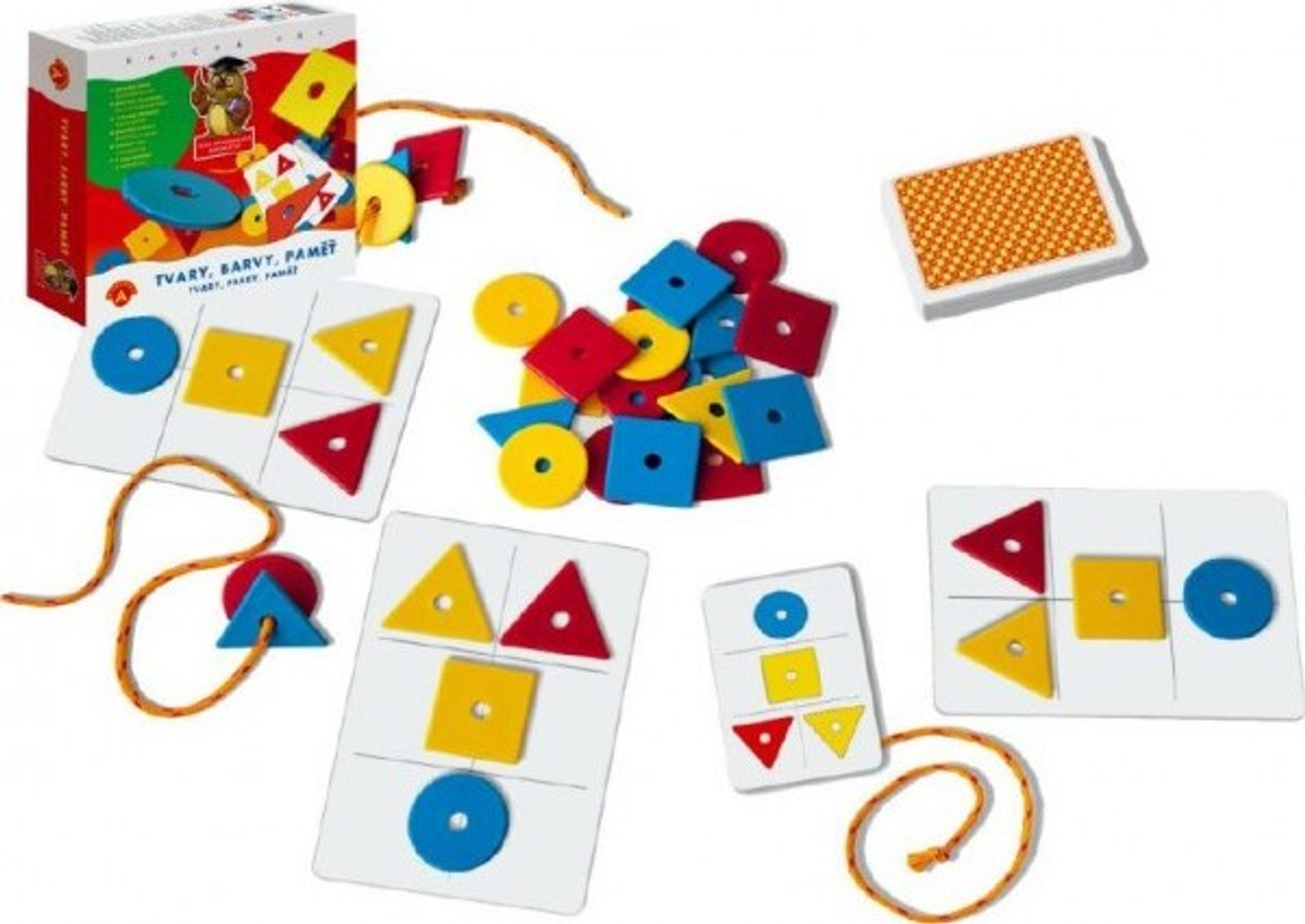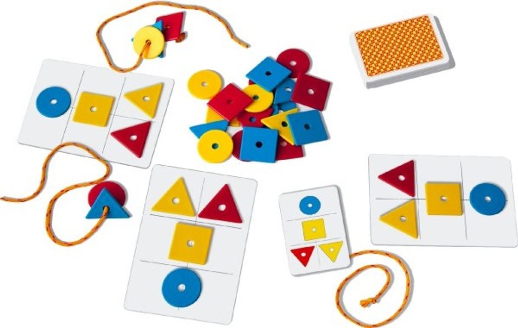 Hráči mají za úkol skládat žetony různých tvarů a barev podle vzorové karty. Ve druhé variantě je cílem hry navléct na provázek žetony co nejrychleji dle vzorové karty. Atraktivní zábavná naučná hra s navlékáním na provázky. Obsahuje 2 zajímavé varianty hry. Učí barvy a tvary, rozvíjí paměť, postřeh a koncentraci. Pro 2-4 hráče od 5 let.