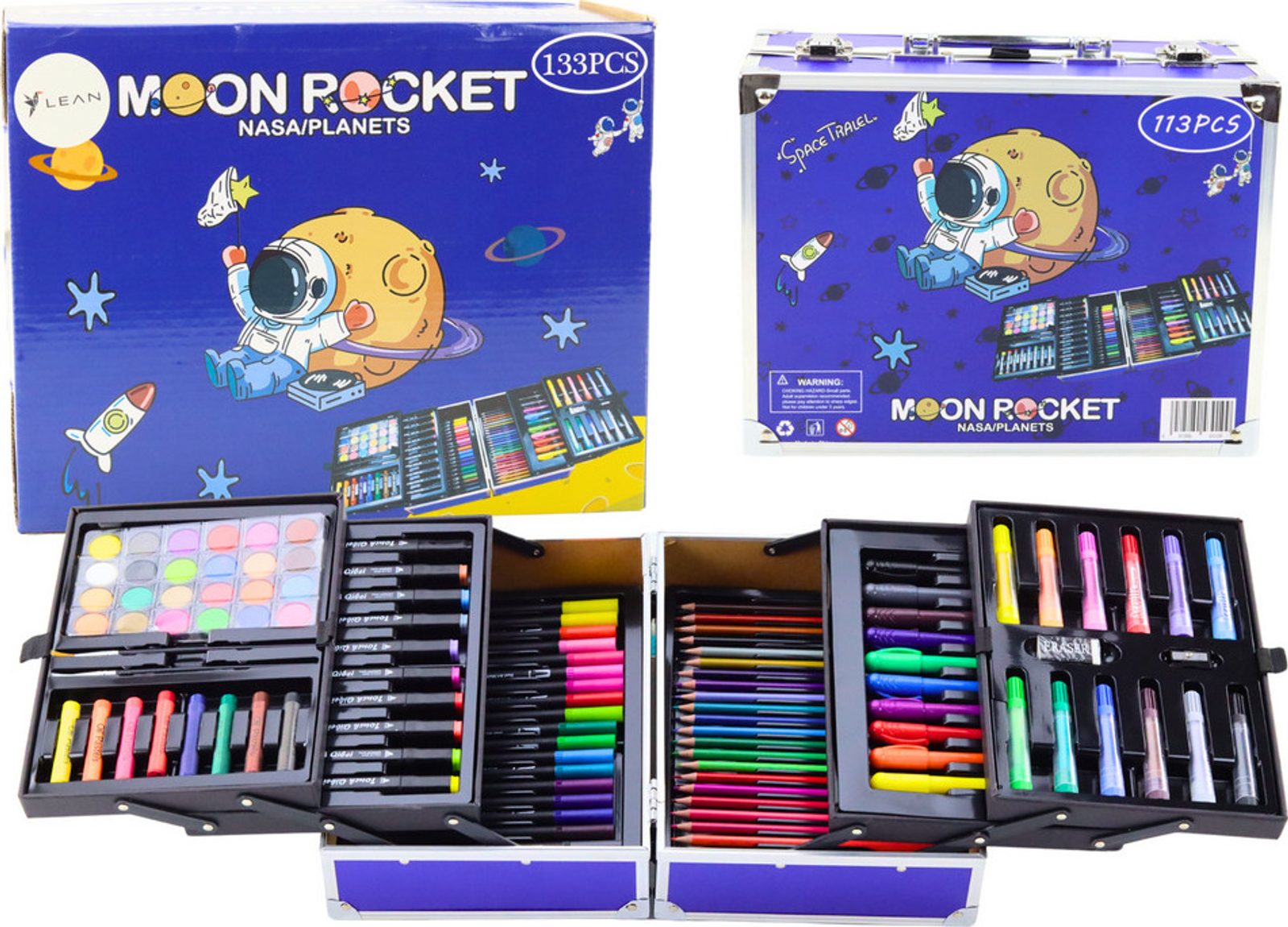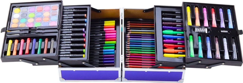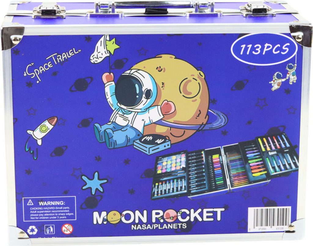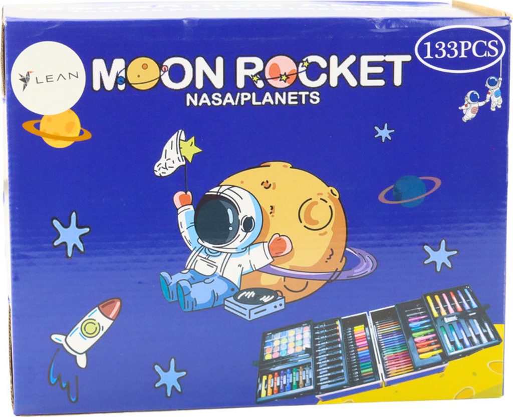 Umělecká sada v rozkládacím kufru zdobeném vesmírným motivem. Toto je perfektní dárek pro každého malého umělce, který ho vezme do světa představivosti a kreativity! Sada obsahuje až 133 různých prvků, které vašemu dítěti umožní vyzkoušet si různé techniky malby a kresby. Najdete akrylové popisovače, oboustranné popisovače a oboustranné popisovače, které kombinují funkčnost tenkého a tlustého hrotu, což umožňuje kreslit jak přesné detaily, tak větší plochy.