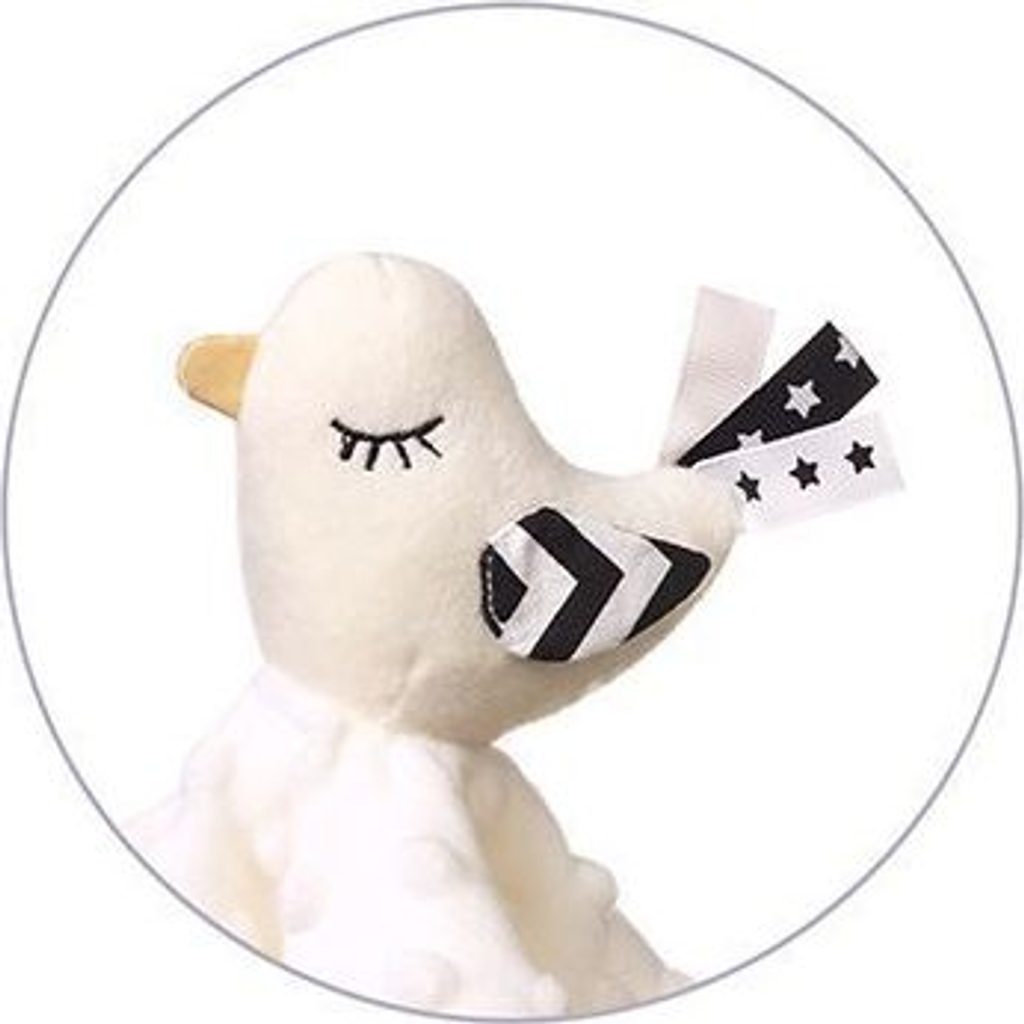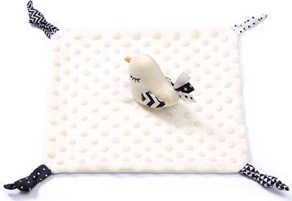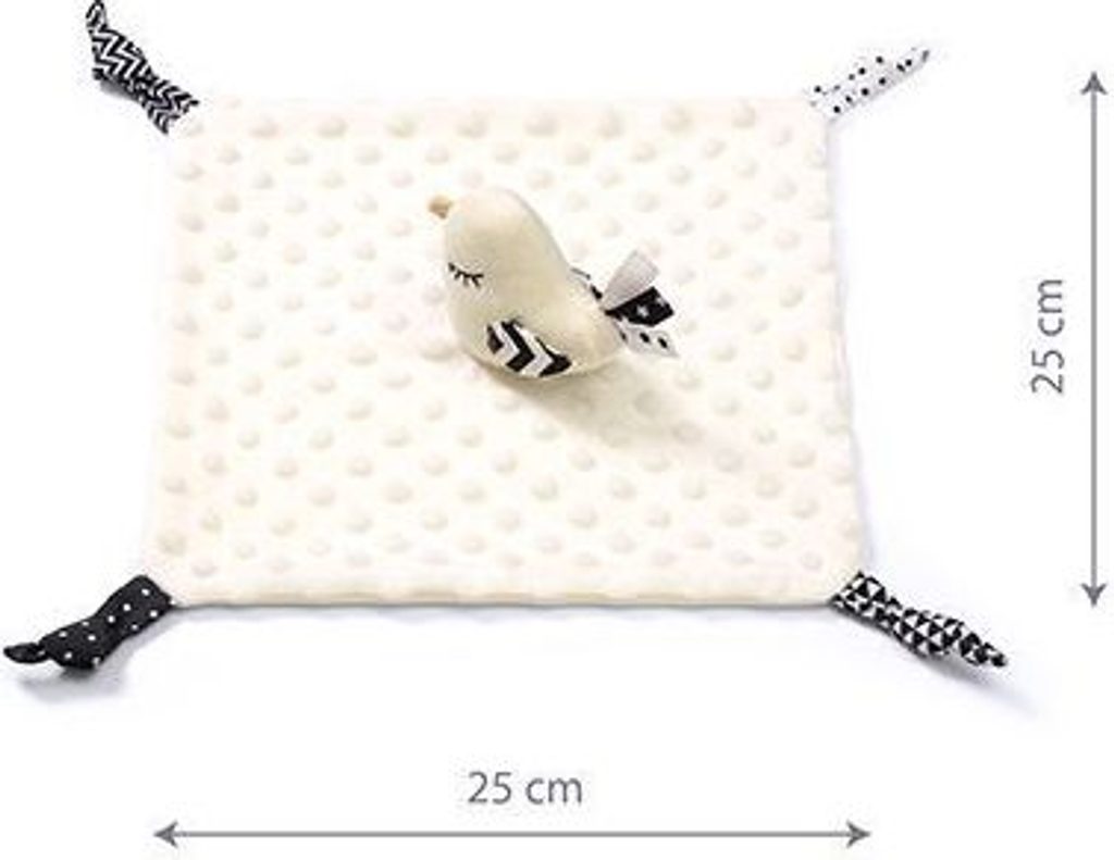 Usínáček s roztomilým ptáčkem v barvách černá a bílá je funkční produkt dva v jednom: deka a plyšová hračka. Je to také vzdělávací hračka. Rozvíjí smysly miminka od prvních dnů života. Minky bavlněný materiál má texturu s drobnými cvočky, které stimulují hmat. Podobně měkké uzly nebo stuhy podporují úchopová cvičení. Materiál je vzdušný a jemný.
