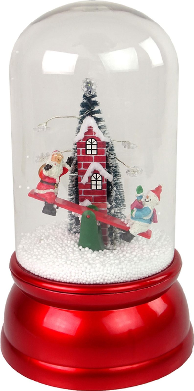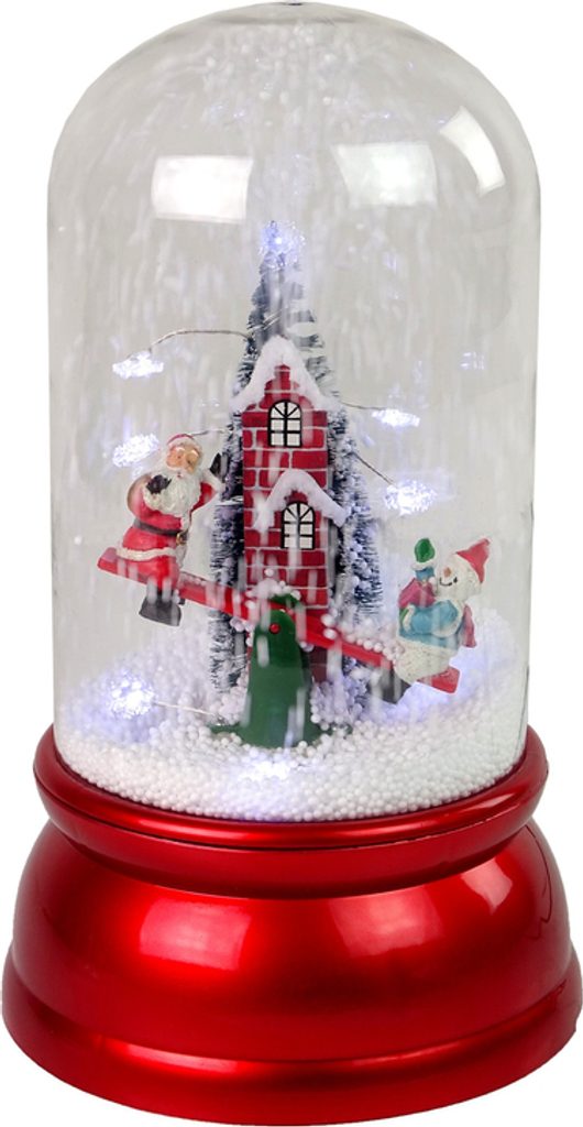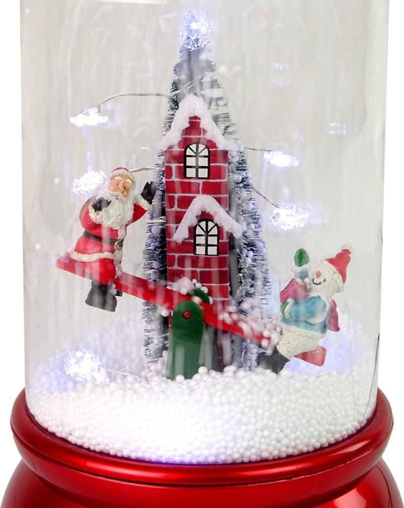 Skleněná ozdoba z odolného plastu a skla, vánoční ozdobu lze používat každý rok, takže je velmi ekonomickou volbou a nákupem, který vydrží roky. Uvnitř skleněné dekorace je veselý Santa se sněhulákem na houpačce, vzadu je vysoký zděný komín s vánočním stromečkem. Můžete se přesunout do světa plného sněhu a vánočních symbolů. Čerpadlo uvnitř dopravuje sníh ze základny a rozstřikuje jej shora, čímž vytváří dojem padajícího sněhu.