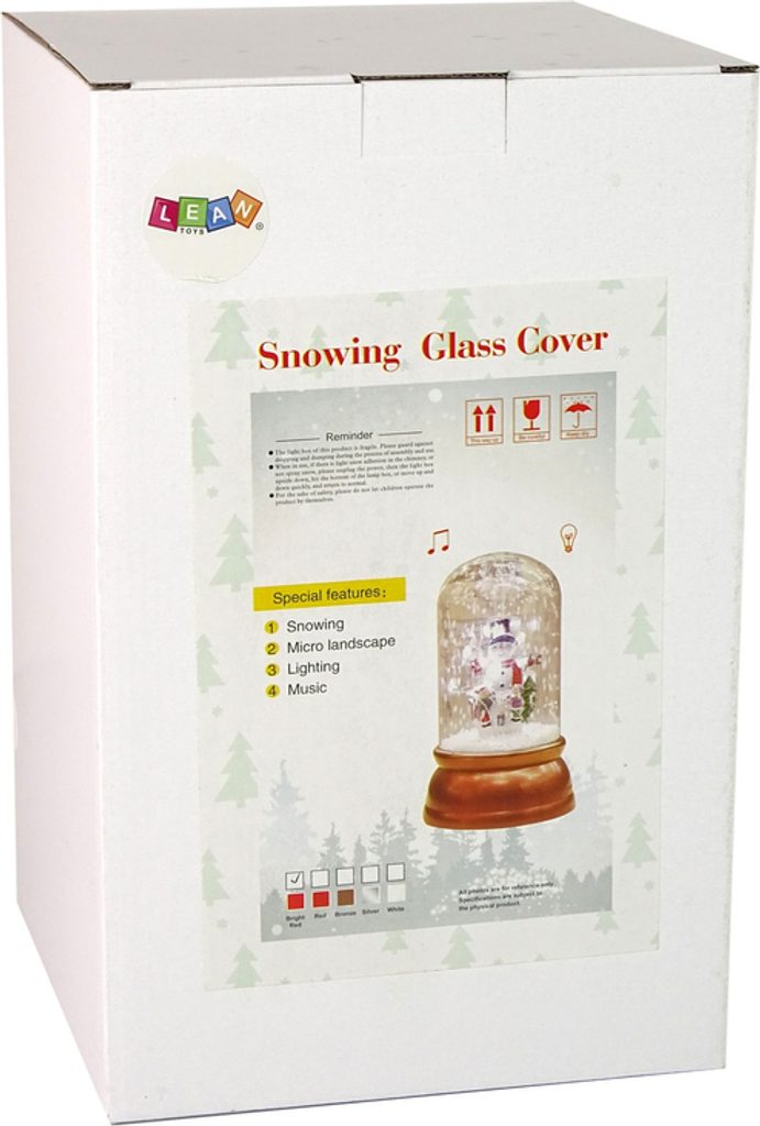 Uvnitř skleněné dekorace je veselá rodinka sněhuláků, kteří zpívají krásné koledy u vánočního stromku a ze stromečku se snáší umělý sníh. Kromě padajícího sněhu má  zvukové a světelné funkce.