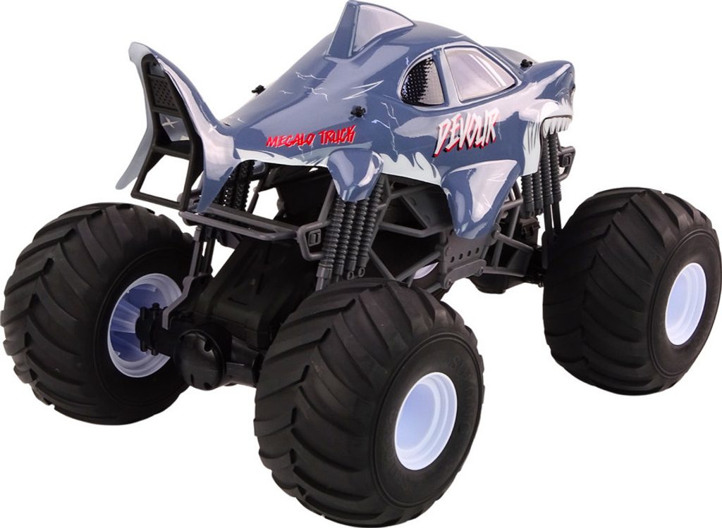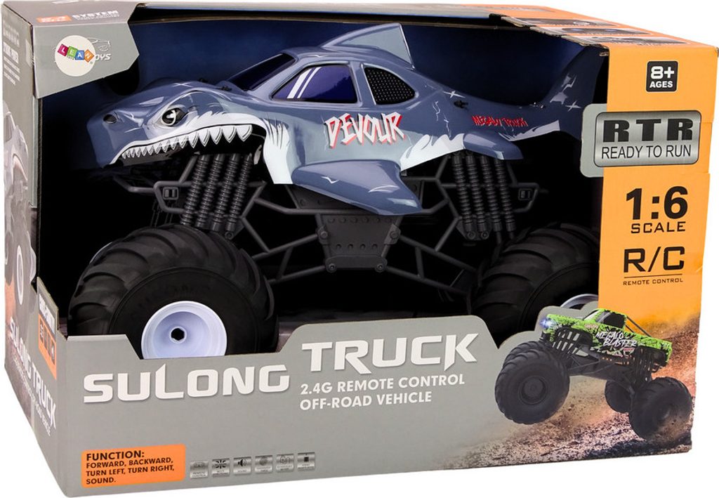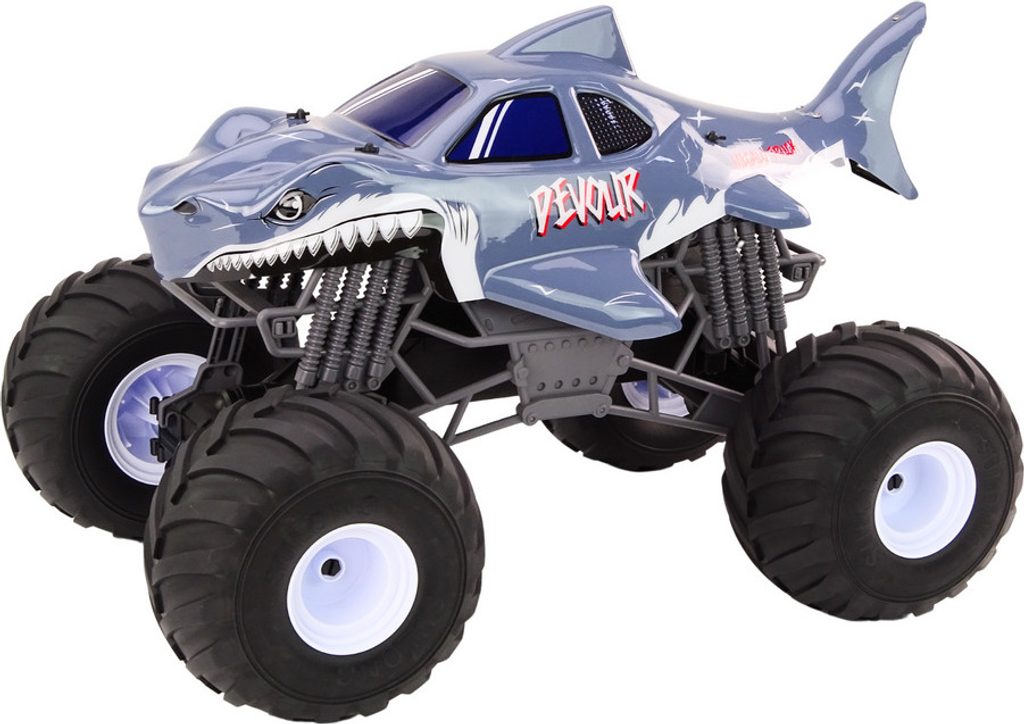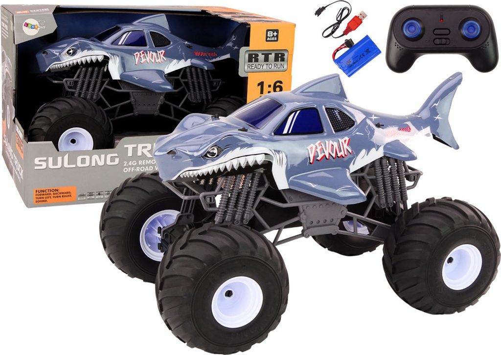 Působivé obrovské terénní auto s motivem žraloka je snem každého nadšence do vozidel na dálkové ovládání! Postaveno v měřítku 1:6 se majestátně prezentuje uživateli i pozorovatelům.