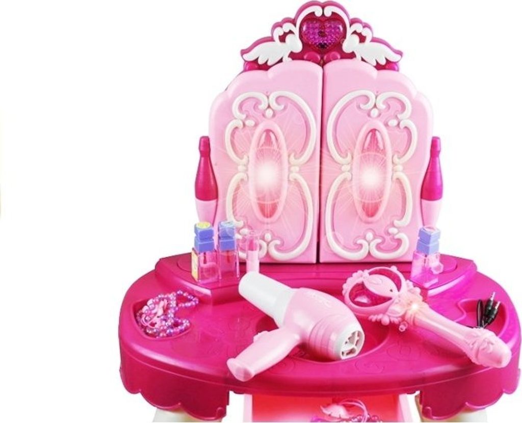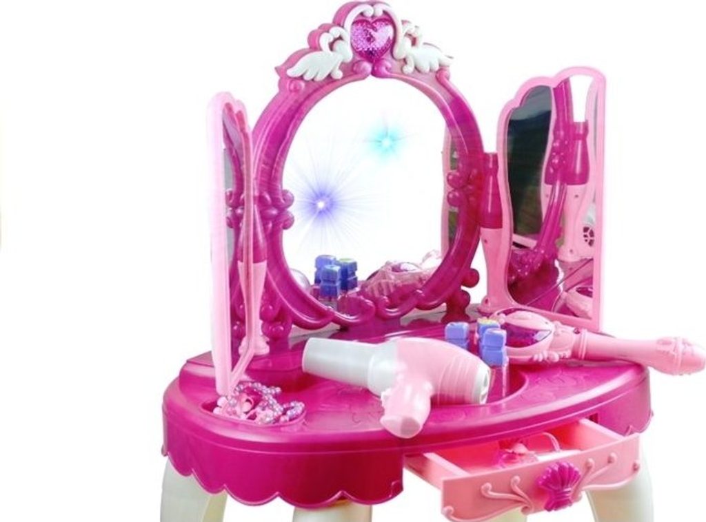 Pokud je vaše dcera milovnicí make-upu, bude to pro ni perfektní dárek. Umyvadlové dveře se otevírají hůlkou. Toaletní stolek s otevíracími dvířky krásně ozdobí pokojíček malé princezny. Velký toaletní stolek se zvuky, světly a připojením MP3, skutečný funkční fén a hologram na zrcadle.