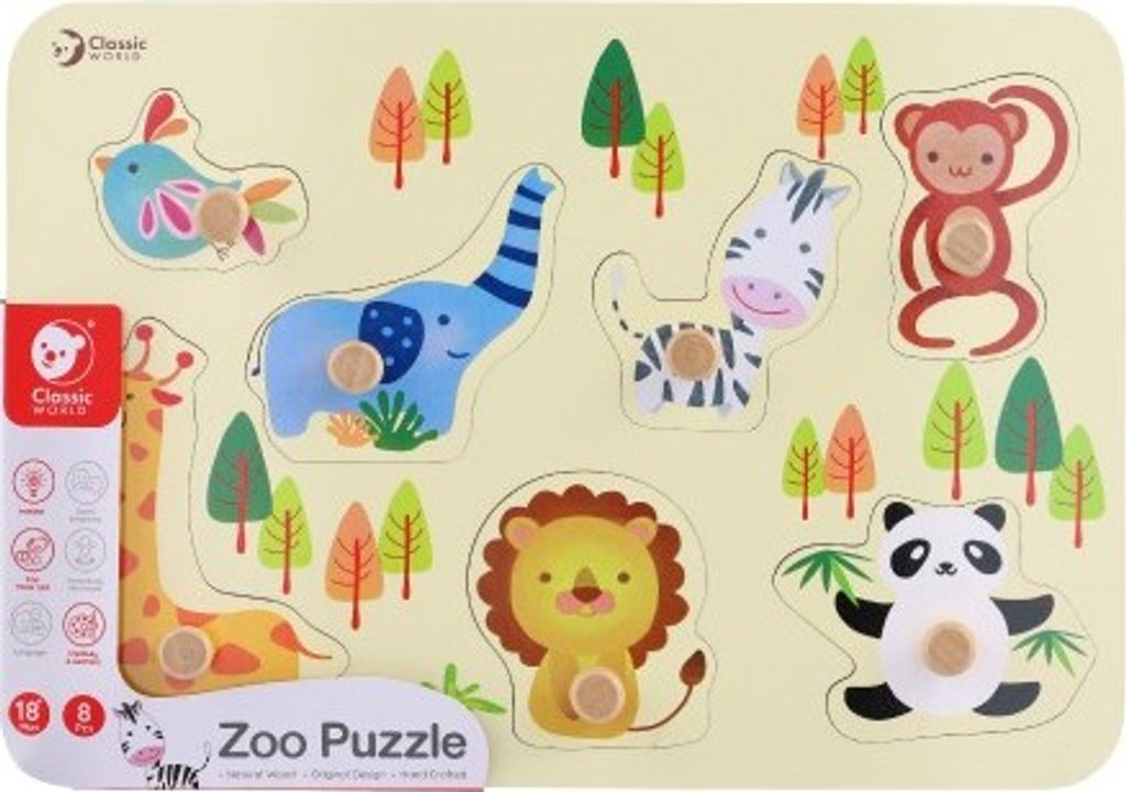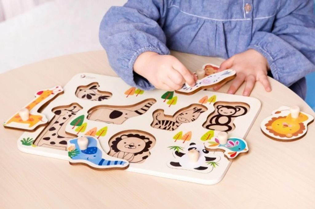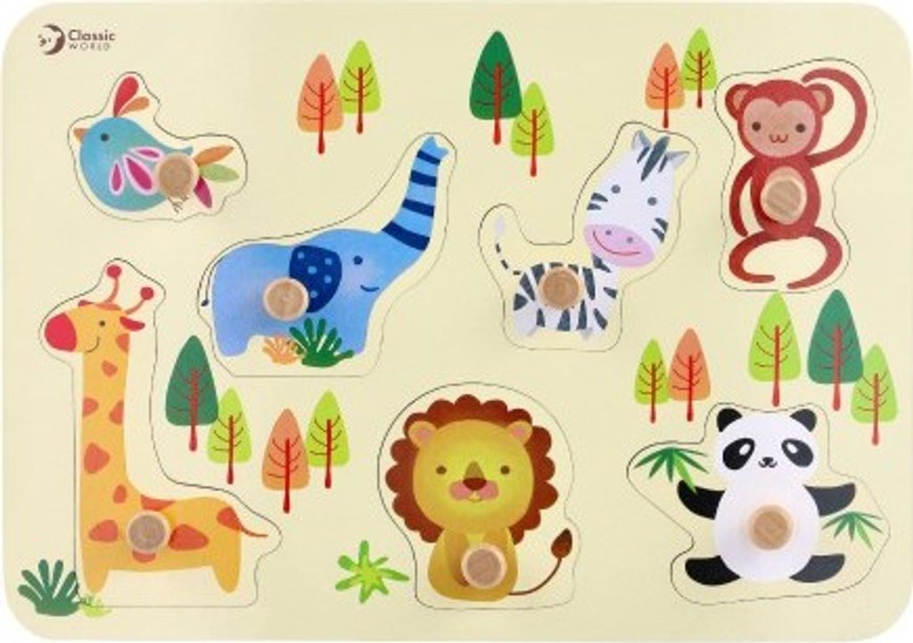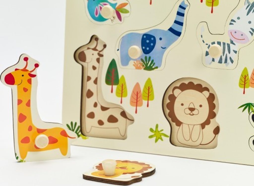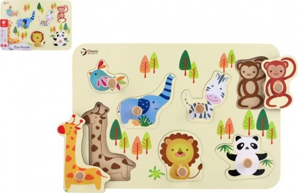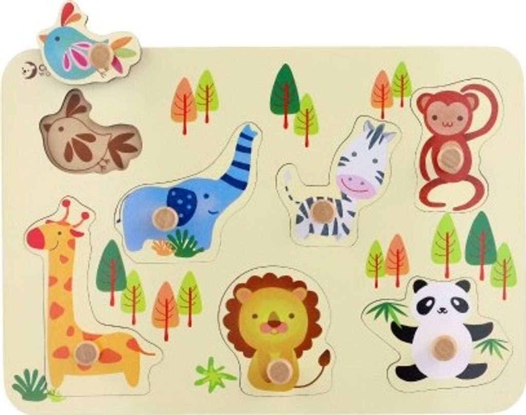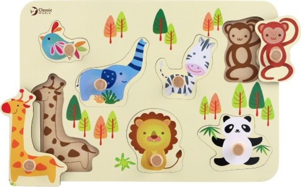Naučte své dítko rozeznávat zvířátka v ZOO už od kolébky. S dřevěnou vkládací destičkou si nejvíc vyhrají prckové od 18 měsíců, spolehlivě ale zaujme i mladší zvědavce. Umisťováním zvířátek do správných otvorů (ale i jejich vyhazováním, strkáním do pusy či schováváním na nejtajnější místa) si děti procvičí motoriku, fantazii a rozlišovací schopnosti. Kvalitní dřevo pro vkládačku je precizně opracováno tak, aby dítěti nehrozilo poranění ani při divočejším zacházení. Vkládačka obsahuje 8 dílů včetně destičky.