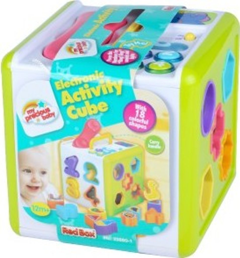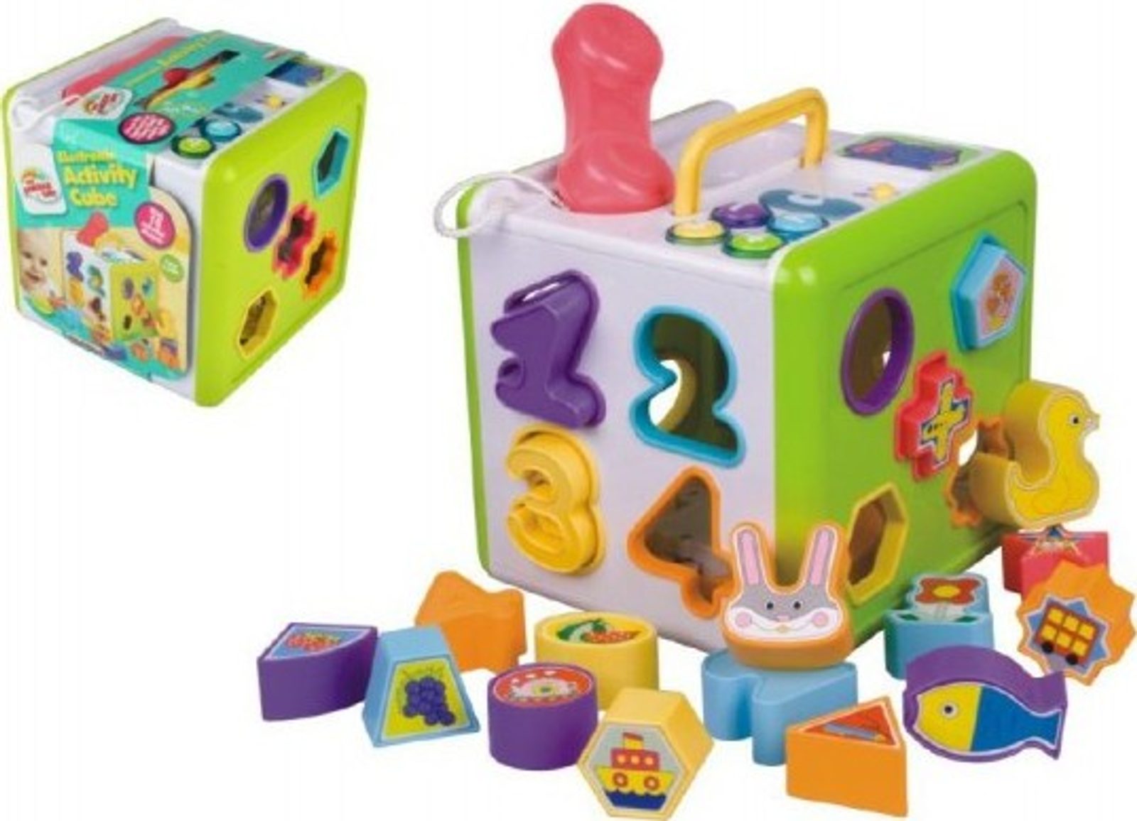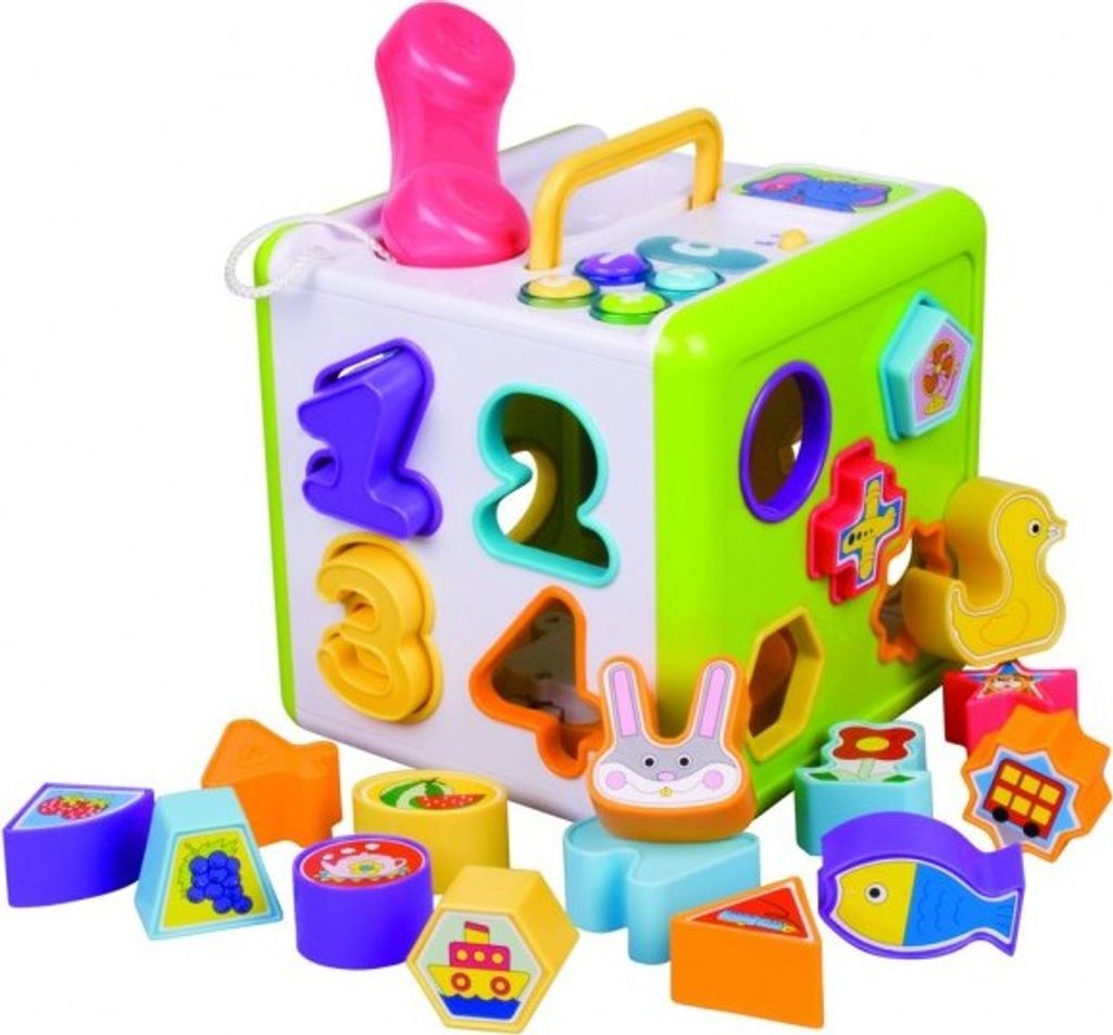 Barevná vkládačka s telefonem a jeho funkcemi. Na každé straně kostky jsou otvory pro vkládání tvarů, písmen, číslic, zvířátek.Kostka vydává světelné i zvukové efekty, na vrchní straně má madlo pro lepší přenášení a 18 vkládacích dílků. Rozměr: 18 x 18 x 18 cm, na baterie Vhodná od 12 měsíců