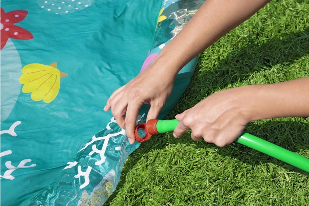 Vodní podložka má podobu mělkého brouzdaliště vytvořeného pomocí nafukovacího okraje, který zadržuje vodu. Podložku jednoduše připojte k zahradní hadici a vytvořte jemnou fontánu.