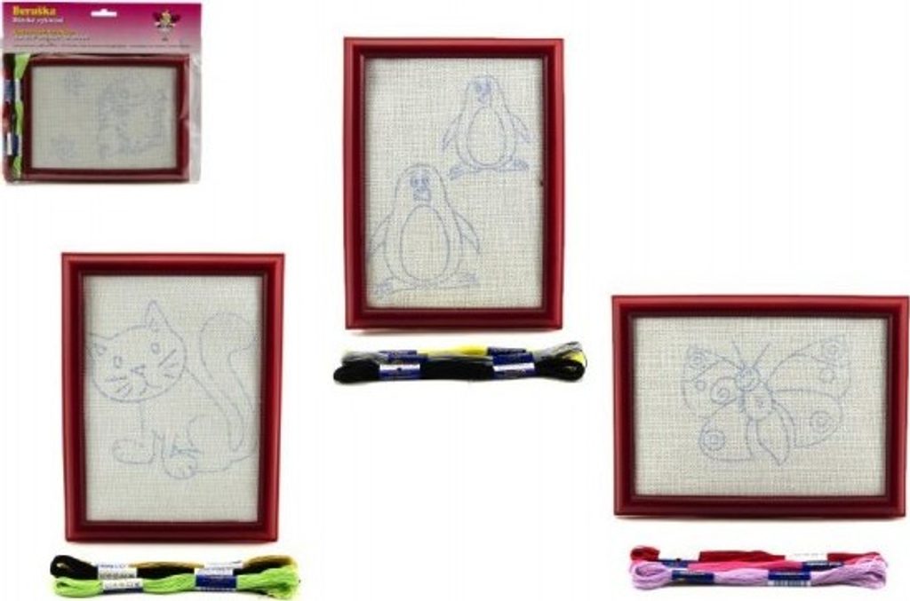 Kreativní set na vyšívání pro všechny šikovné holčičky a malé švadlenky. Sada obsahuje plastový rámeček s napnutým plátýnkem s předtištěným obrázkem. Sada v několika barevných kombinacích bavlnek a rámu, a v několika motivech obrázku.