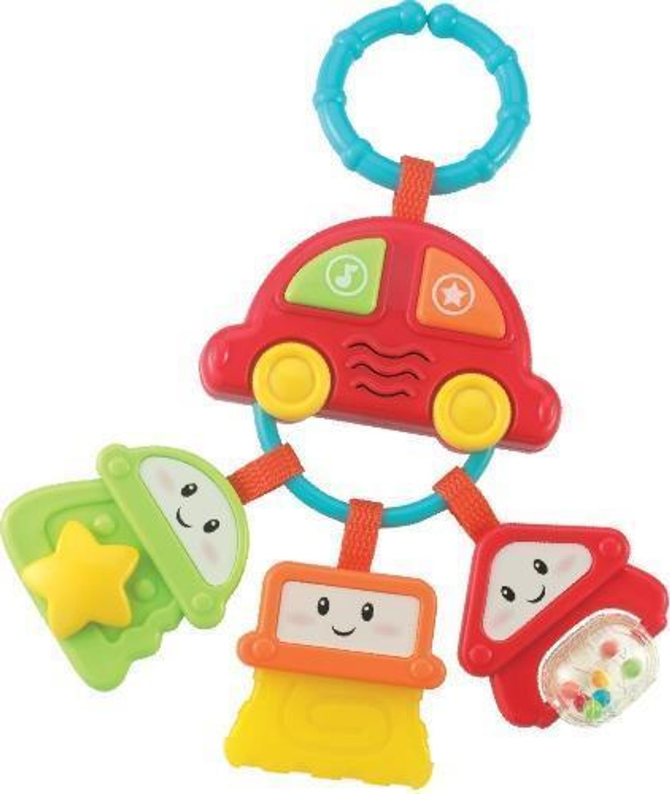 Příjemné, živé barvy upoutají pozornost každého dítěte a vybízejí je ke hře. Hračku lze použít i jako kousátko. Jedná se o přívěsek tvořený kroužkem na klíče ve tvaru auta se třemi klíči. Má dvě barevná funkční tlačítka, která spouštějí zvuky, zvuky a vtipné melodie.