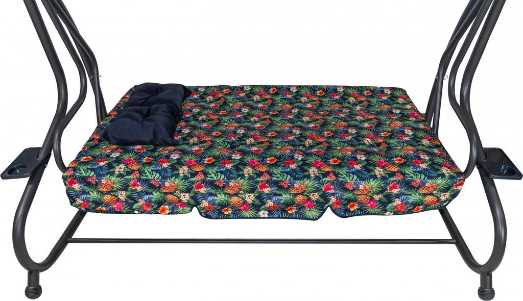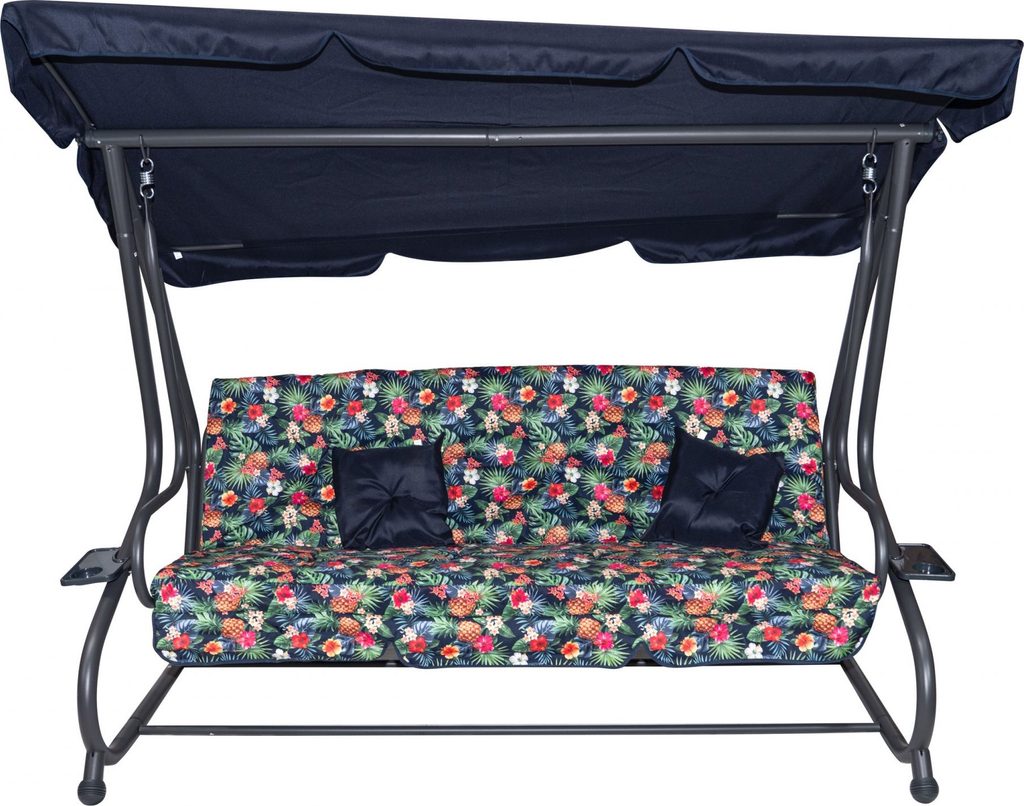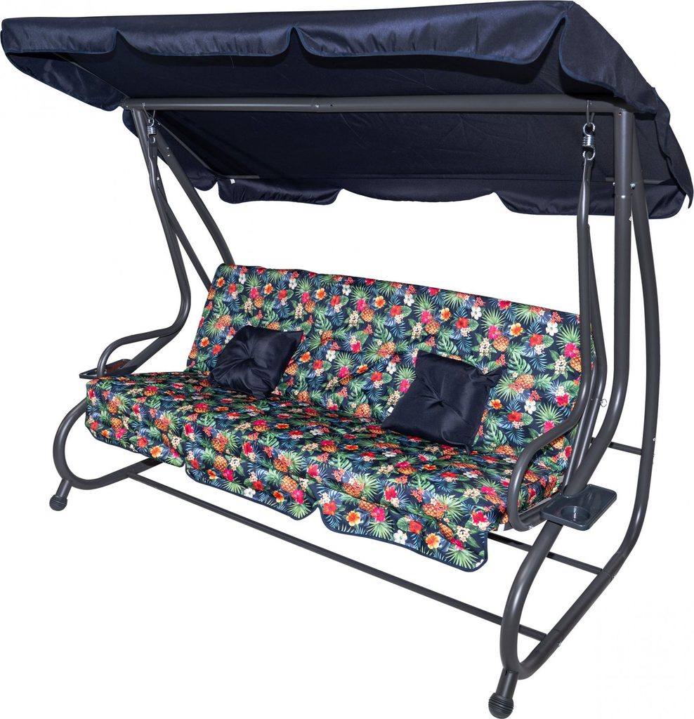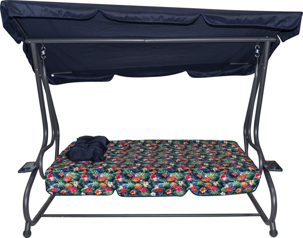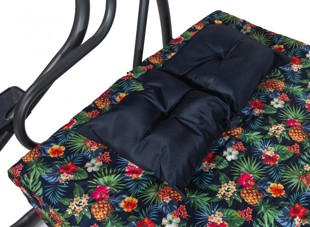 Zahradní houpačka s polohovatelným sedákem a nastavitelnou střechou. Textilie je určena pro venkovní použití díky vysoké odolnosti vůči nepříznivým povětrnostním vlivům.