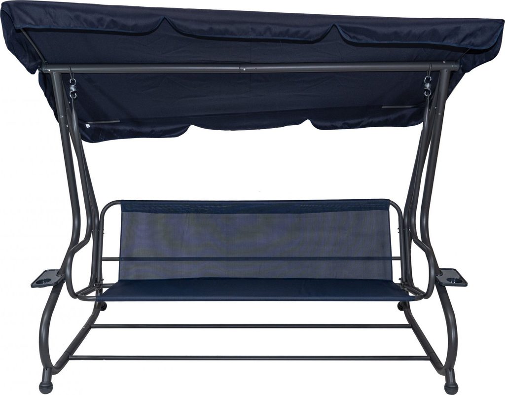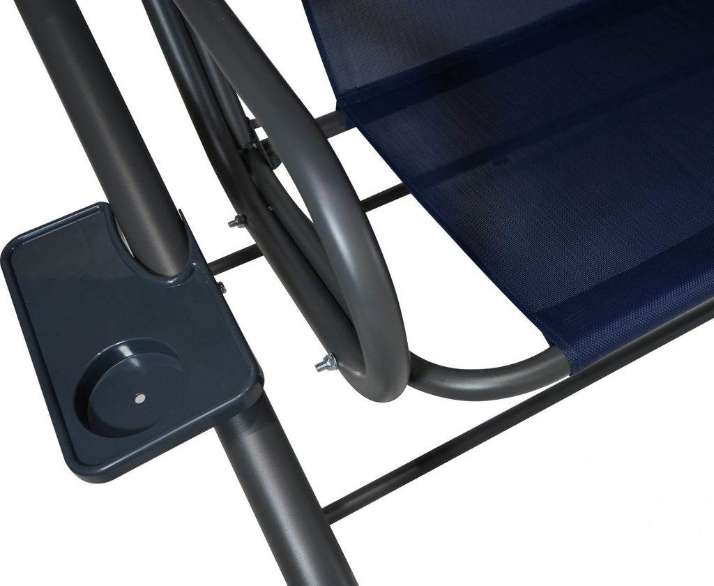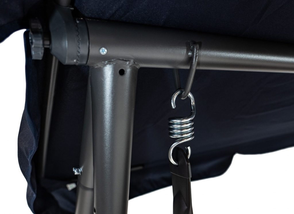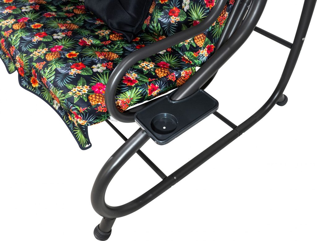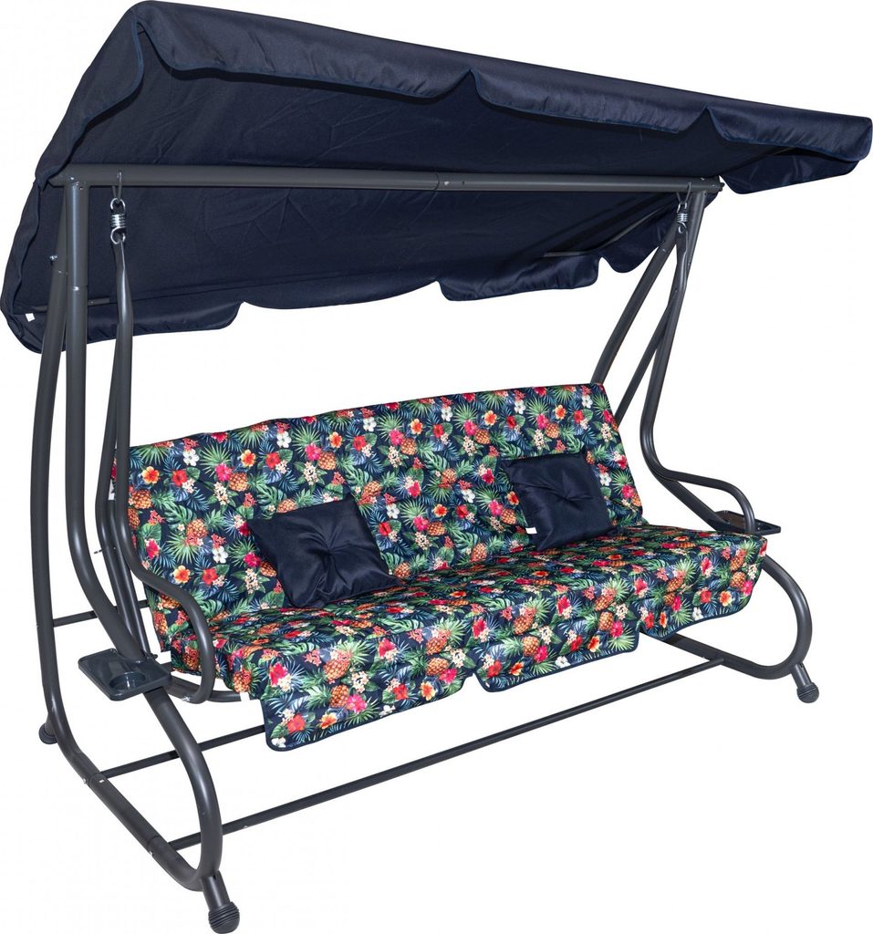 Zahradní houpačka s polohovatelným sedákem a nastavitelnou střechou. Textilie je určena pro venkovní použití díky vysoké odolnosti vůči nepříznivým povětrnostním vlivům.
