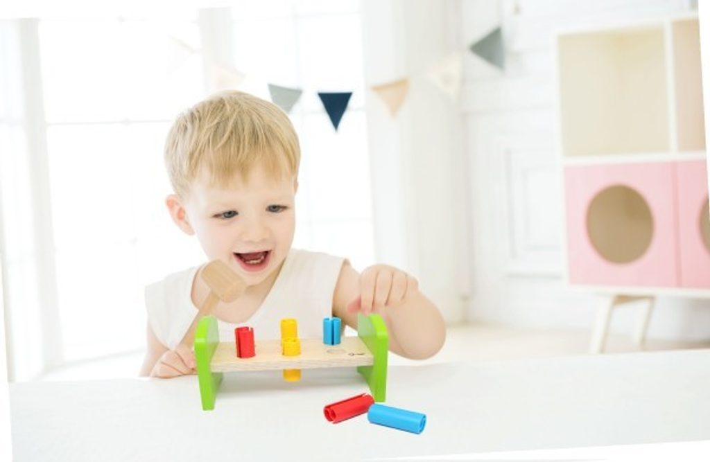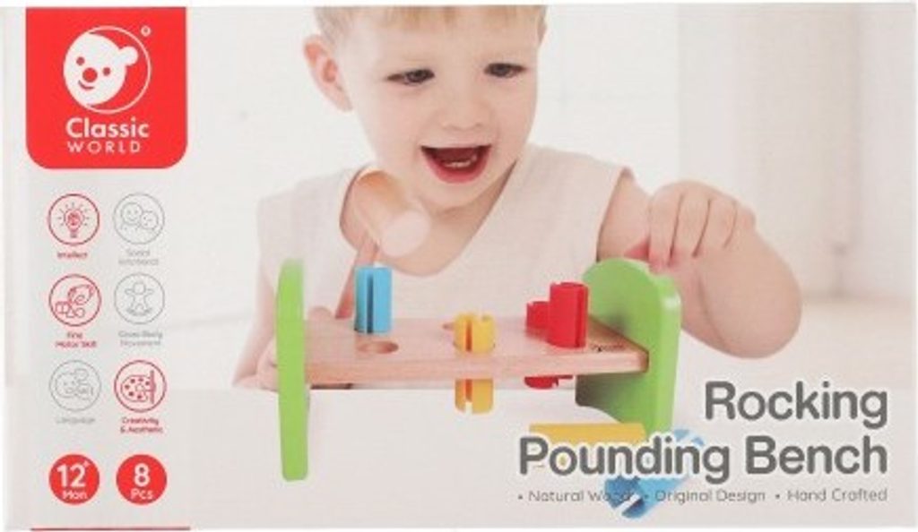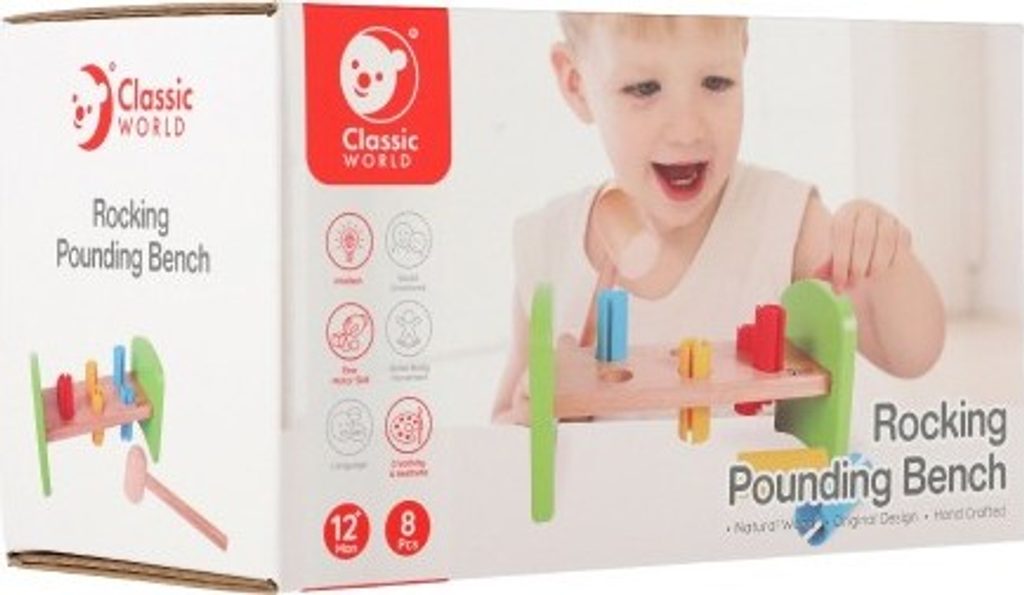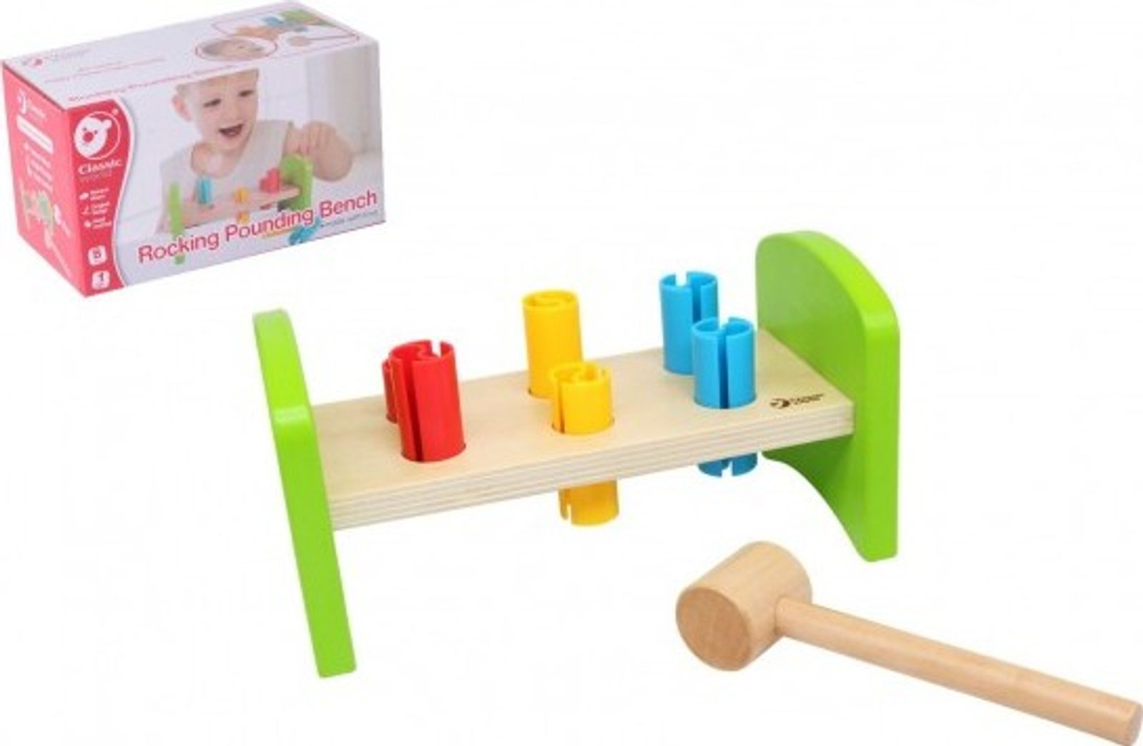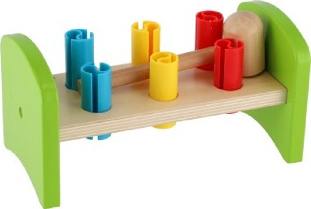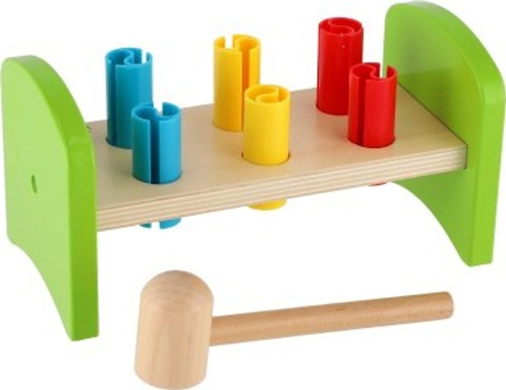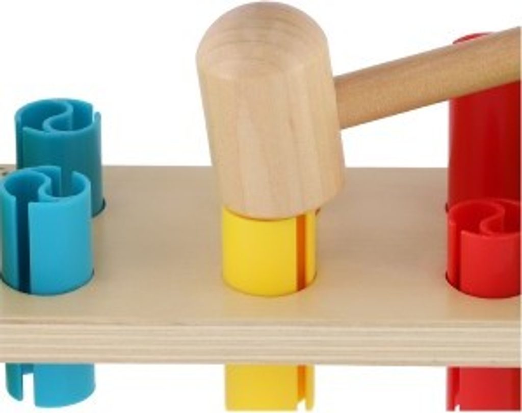 Dřevěná zatloukačka s kladívkem ve veselých barvách je skvělá hračka pro malé kutily, kteří se chtějí podobat svému tatínkovi. Balení obsahuje zatloukačku, kladívko a 6 ks plastových barevných kolíků. Hračka rozvíjí jemnou motoriku rukou. Užívejte spoustu zábavy s touto, z jedné strany stabilní z druhé strany houpací, zatloukačkou.