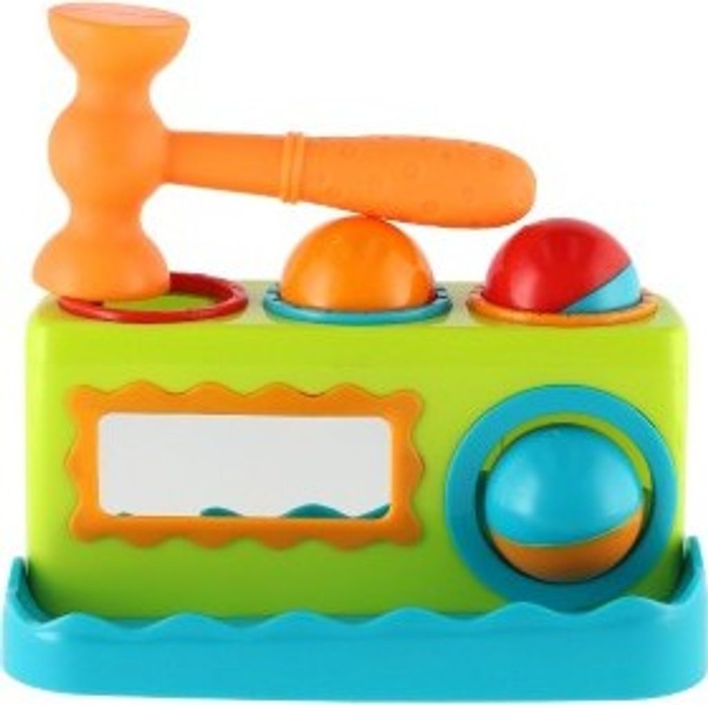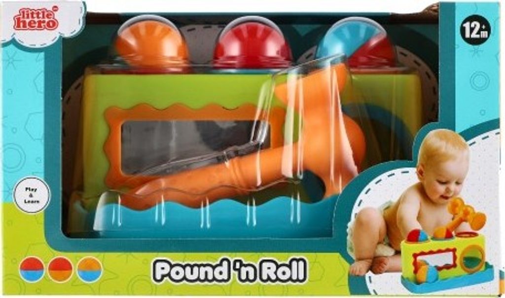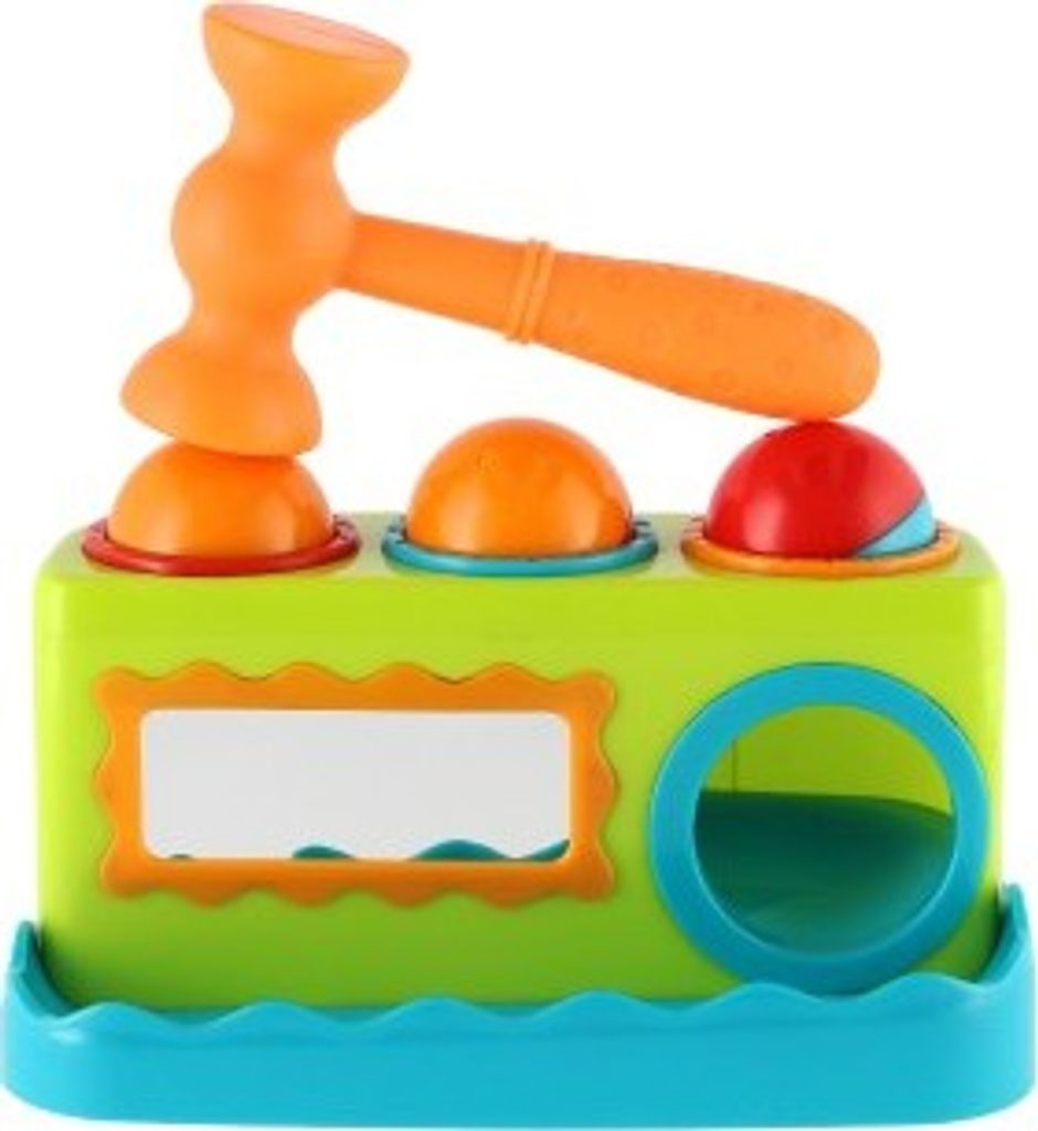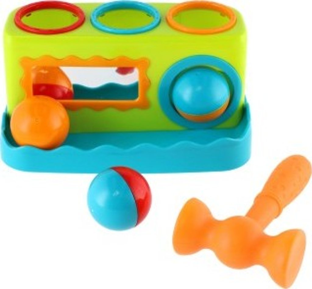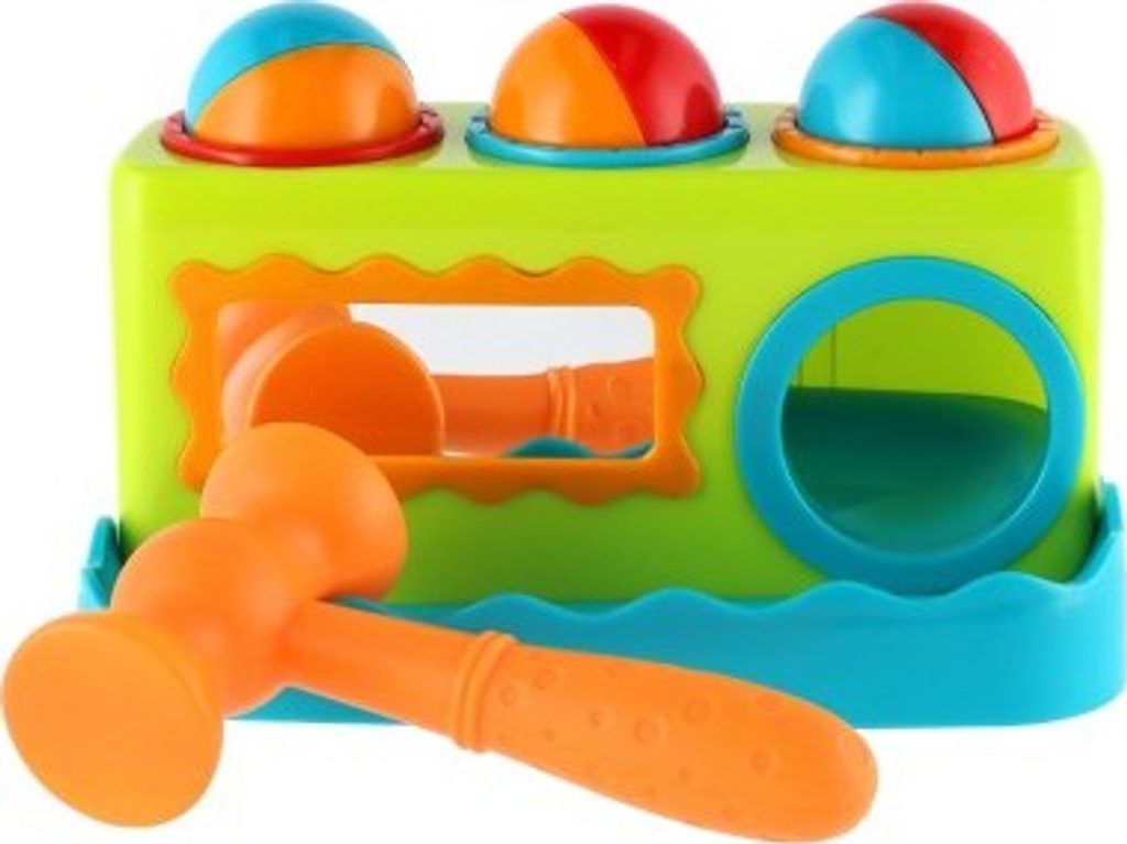 Zatloukačka se třemi zatloukacími balonky a kladívkem. Na přední straně zatloukačky je zrcátko. Rozměr: 21 cm. Rozměr krabice: 28 x 16,5 x 16 cm. Vhodná od 12 měsíců