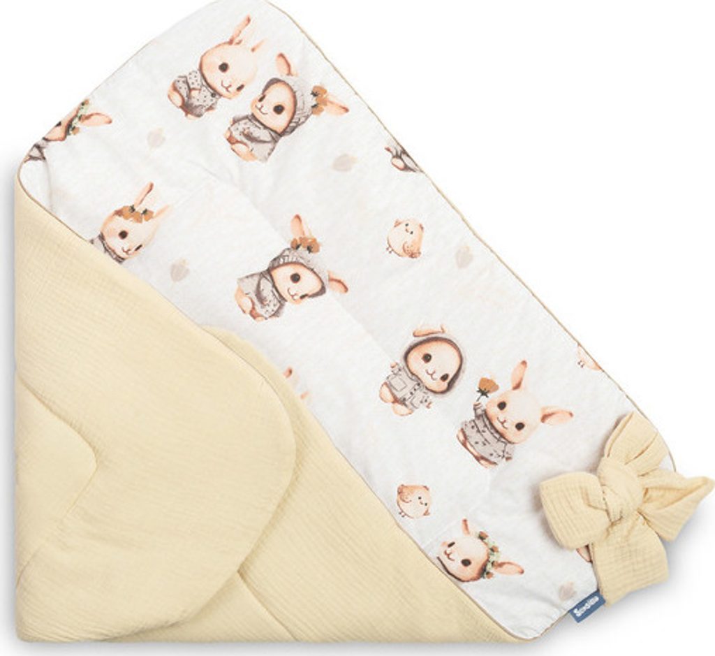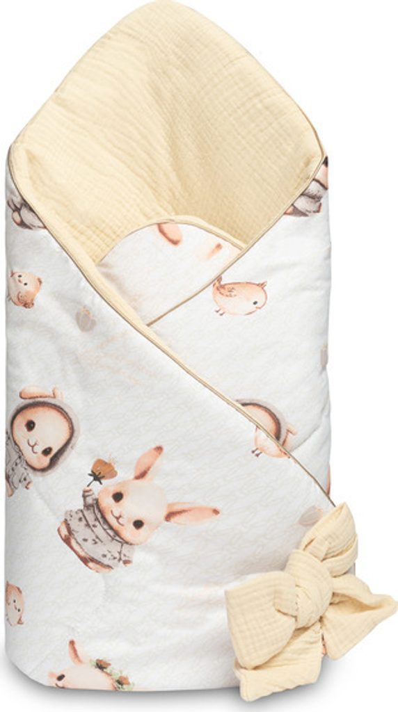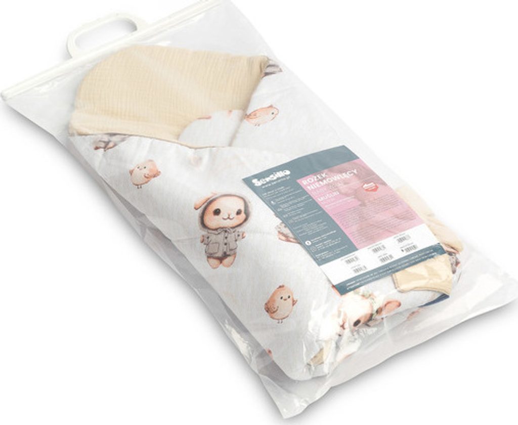 Jednostranná mušelínová dětská zavinovačka je vytvořená s ohledem na novorozence a kojence. Zapínání na suchý zip umožňuje pohodlné držení dítěte při krmení a uspávání. Po rozložení lze zavinovačku úspěšně použít jako peřinku do postýlky nebo kočárku. Lze jej také použít jako podložku na hraní. Je vyrobená z bavlněných látek: potištěné bavlny a mušelínu. Výplň zavinovačky tvoří antialergické silikonové nadýchané rouno. Vysokou kvalitu zpracování podtrhuje estetické lemování.