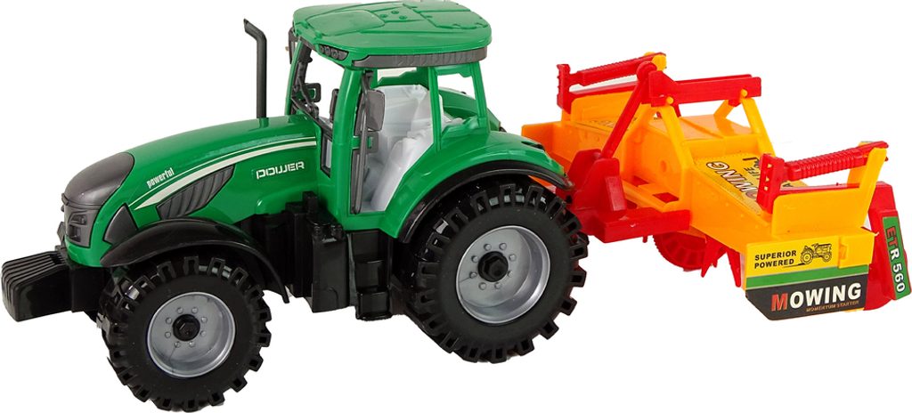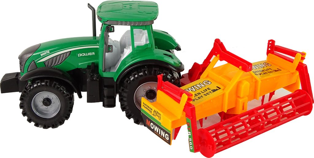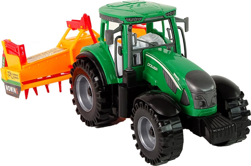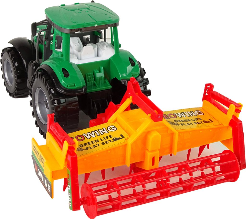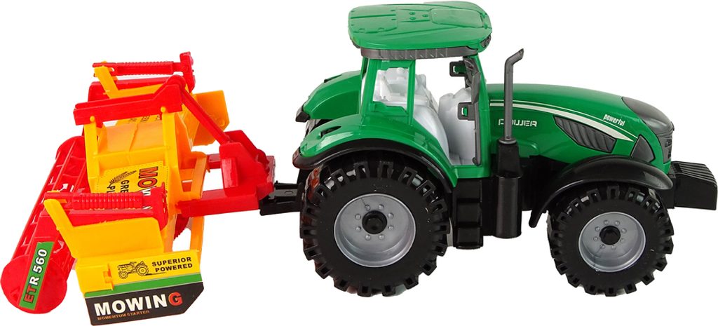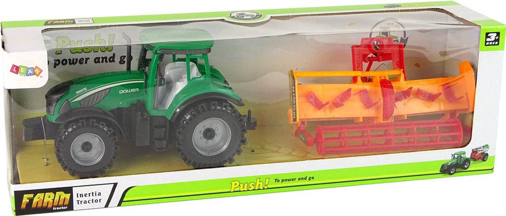 Sada obsahuje zelený traktor s oranžovo-červeným kultivátorem, který lze připevnit na zadní část vozidla, což poskytuje dítěti ještě více zábavy. Traktor má setrvačník, který mu umožňuje pohyb vpřed a vzad.