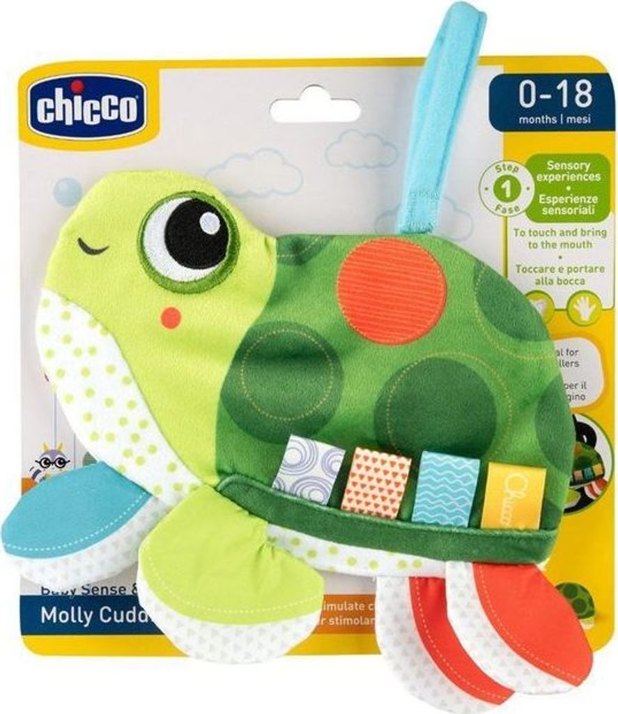 Šustící želva je okouzlující hračka, která rozvíjí smysly dítěte a stimuluje jeho manuální dovednosti. Tato barevná hračka je lehká a plochá, ideální pro malé ručičky. Je vyrobena z měkkých látek s různou texturou, což pomáhá rozvíjet smyslové schopnosti miminka. Při doteku hračka šustí, což ovlivňuje stimulaci sluchu dítěte. Na krunýři želvy je navíc pískací tlačítko. Hračka má také 4 barevné látkové visačky, které děti milují a jsou skvělým cvičením pro koordinaci oko-ruka. Batole je může uchopit a hrát si s nimi a rozvíjet tak své manuální dovednosti. Díky pásku na suchý zip lze želvu snadno připevnit např. na kočárek, aby batole doprovázela na procházce a přitahovala jeho pozornost. Želva Chicco dává dítěti spoustu radosti, rozvíjí jeho smysly a manuální dovednosti.