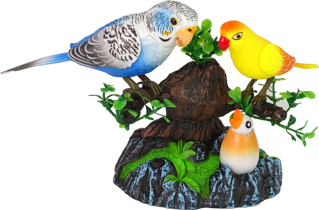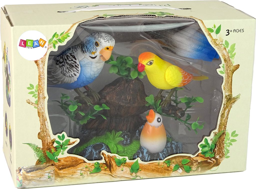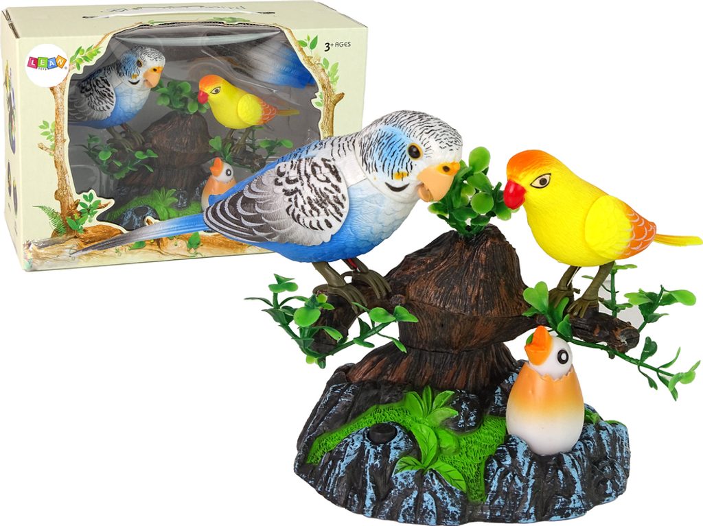Sada obsahuje dva papoušky - modrého a žlutého, umístěného na větvi stromu a pod ním ležícího malého papouška ve skořápce. Ptáci na větvích vydávají různé zvuky a pohybují se, takže se cítíme jako v lůně přírody, zatímco kuřátko září barevným světlem. Pro zapnutí hračky stačí stisknout černé tlačítko.