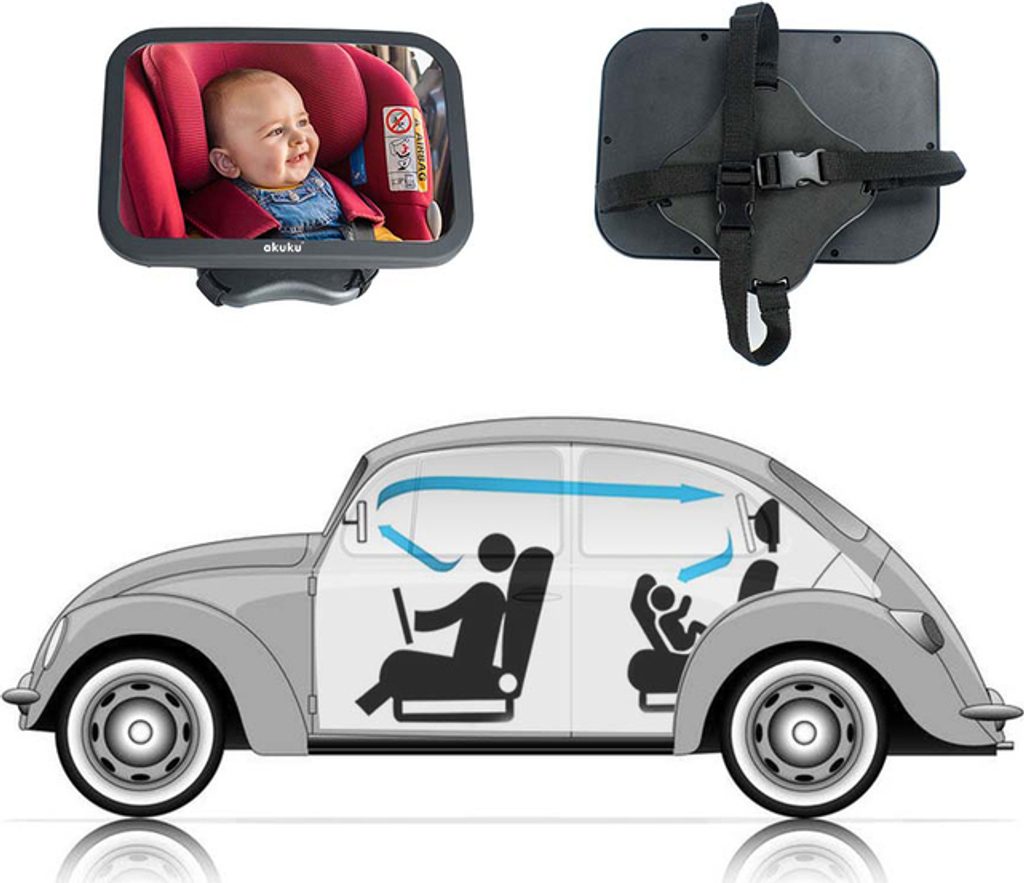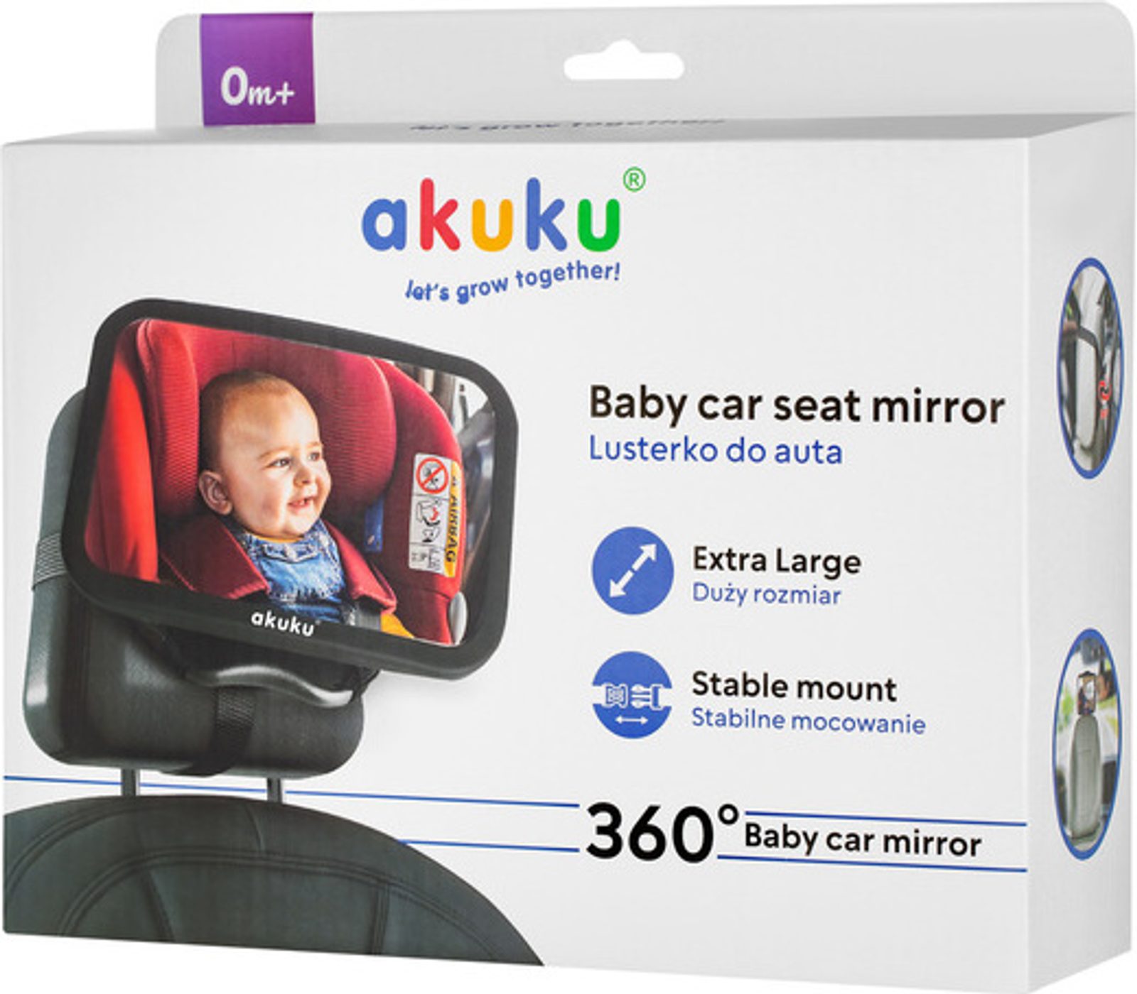 Zrcátko značky "akuku" je speciálně navrženo tak, aby rodiče mohli při cestování autem snadno kontrolovat, co jejich dítě dělá. Zrcátko vám umožní bezpečně pozorovat dítě, které sedí v sedačce čelem vzad. Rodič nemusí otáčet hlavu a neustále kontroluje cestu. Nastavení úhlu pohledu 360° – přizpůsobí zrcadlo jakýmkoli potřebám.